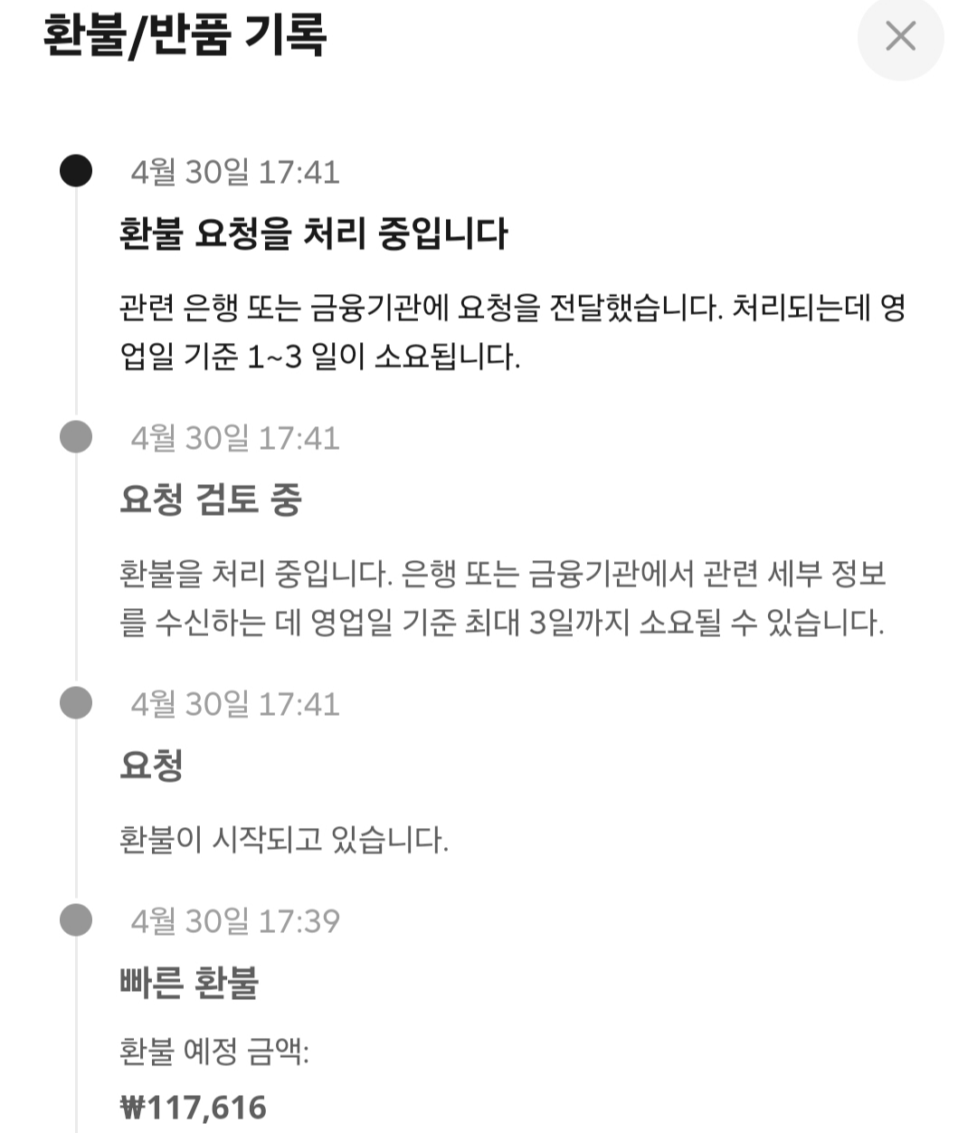4/27 (토) 11:32 PM 환불 및 반품 요청
