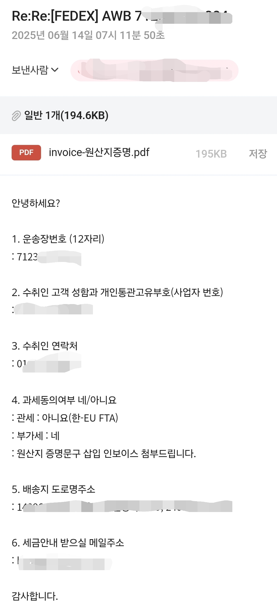 페덱스 담당자가 아래와 같이 정보를 문의하는 메일을 보낸다. 주소지 연락처 개인통관부여부호 등과 함께 관세 동의 여부를 묻는다.