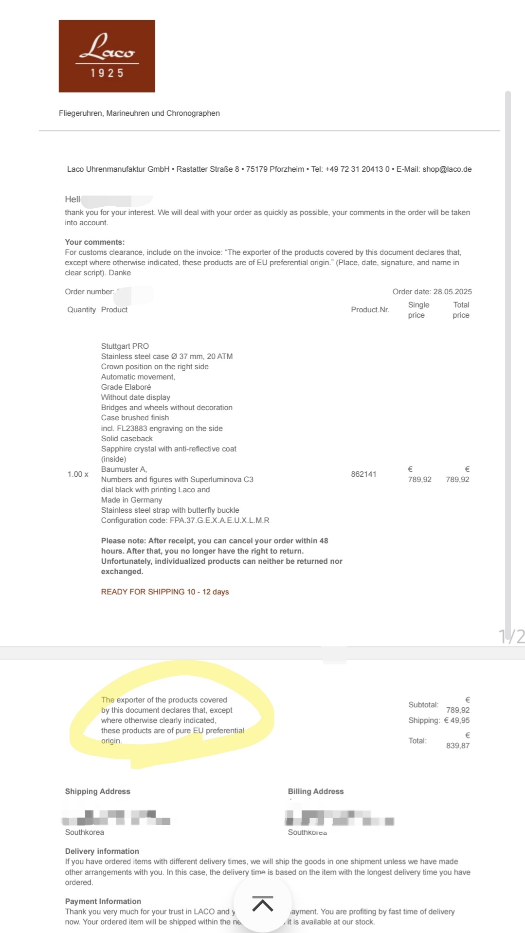 FTA 규정에 따라 인보이스에 해당 물품은 EU 국가에서 생산이 되었다는 생산자의 문구가 있어야 한다. 나는 구매할 때 고객 요청란에 해당 문구를 요청하여서 아래와 같은 인보이스를 받을 수 있었다. 후기들을 보니, 라코 고객 응대가 빠르고 친절한편이기 때문에 주문 후에도 이런 요청메일을 보내도 금방 금방 회신을 주는 것 같다.