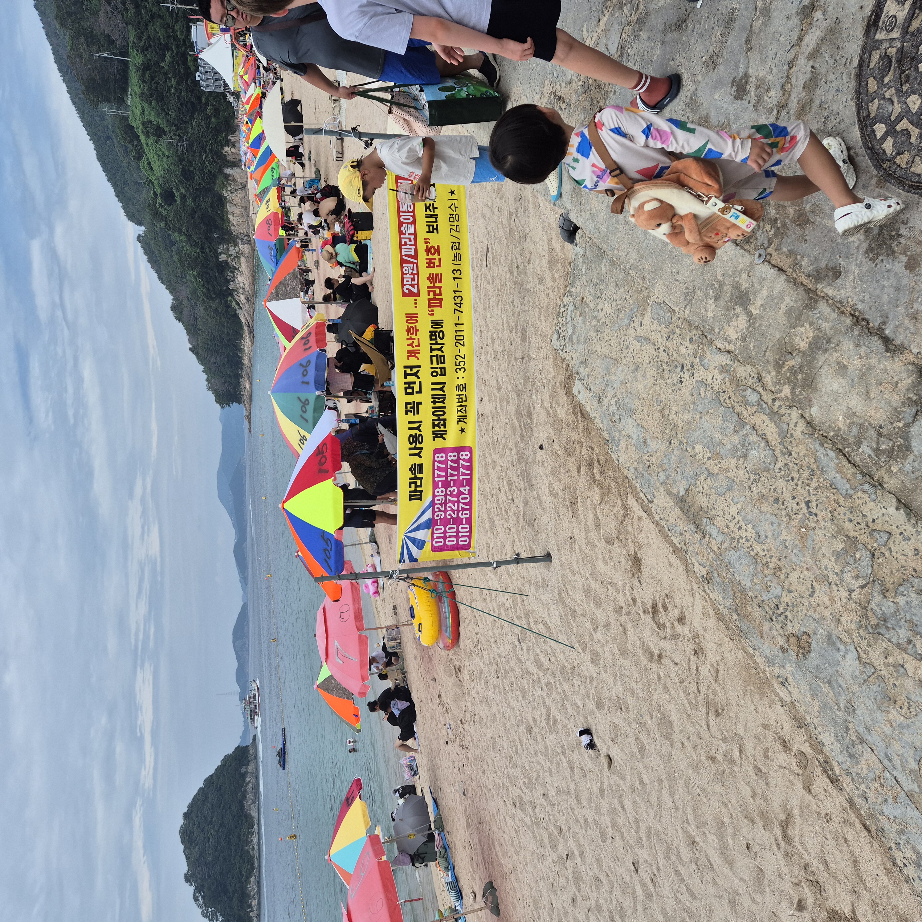 갈매기에게 새우깡을 주며 50분 정도 배를 타고 가니 비진도에 도착할 수 있었다. 일단 배를 타고 떠난다니 뭔가 더 설레고 여행에 재미가 생겼다. 비진도는 크지 않은 섬인데 그것도 항구 바로 앞에 해수욕장이 있어서, 바로 파라솔을 빌려서 놀았다. 남해라 물이 깨끗하고 에매랄드빛이 돌았는데 수면에 해초쪼가리들이 많아서 좀 거슬렸다. 섬이 작다 보니 식당이 마땅치 않다는 말을 보고 점심으로 어제 산 꿀빵과 간단한 간식을 챙겨갔다. 많이들 비진도 섬의 민박을 이용하는 것 같갔는데, 민박을 이용 안한다면 배편은 5시간 정도 텀으로 왕복하면 충분한 것 같았다.