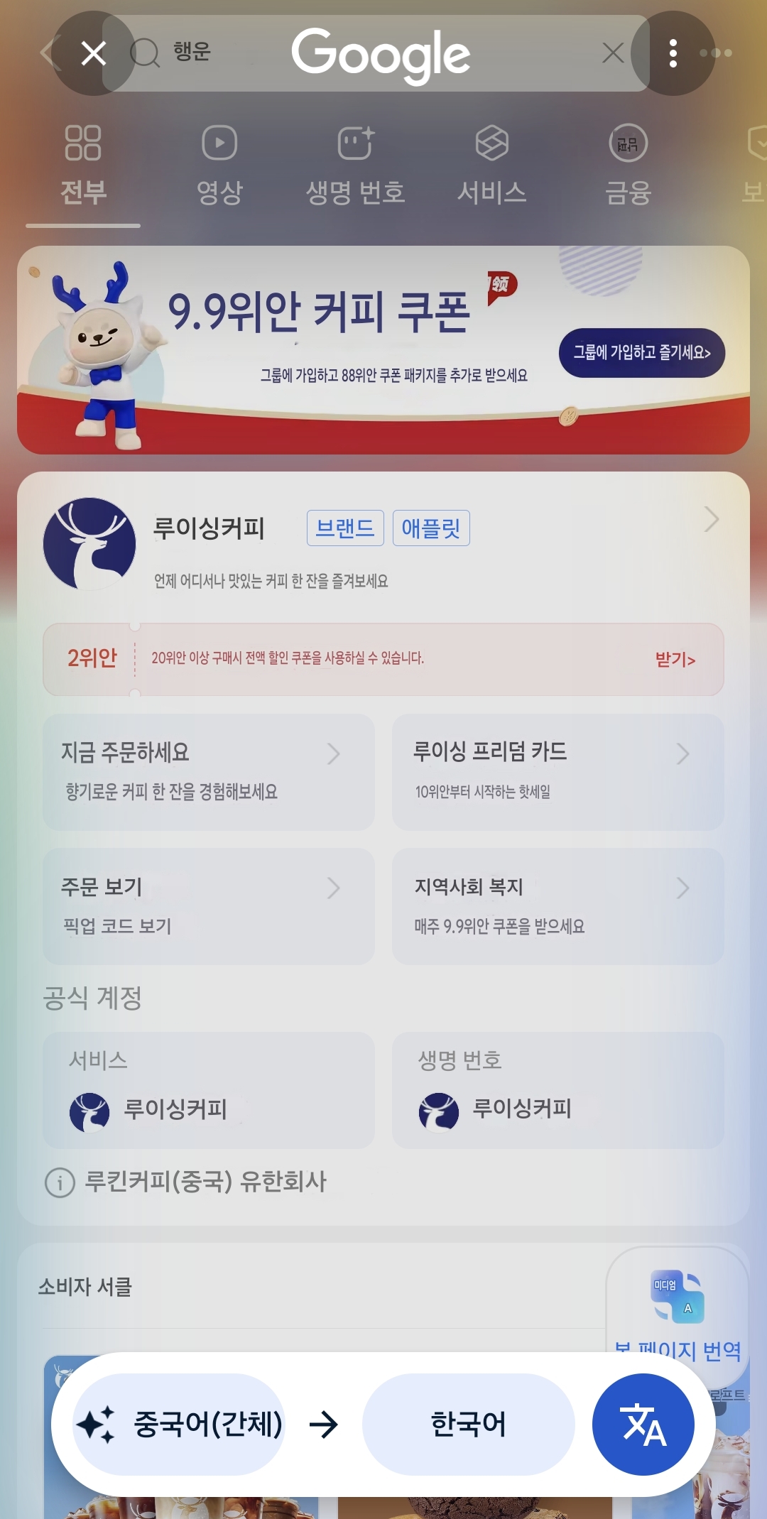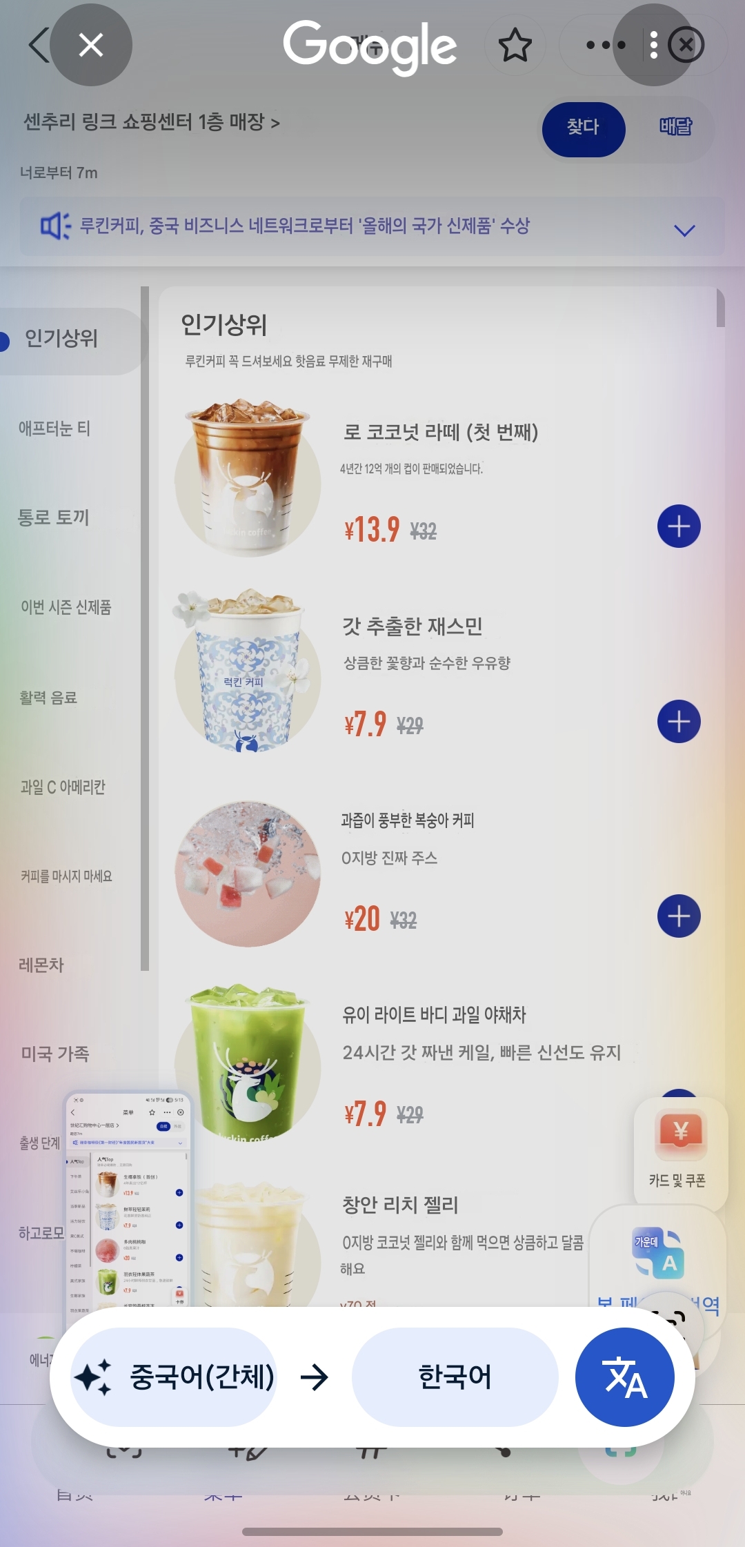 그럼 이렇게 중국말로 열심히 커피 매장이 소개가 된다. 사실 감으로 루이신 커피를 선택하면되지만, 확실히 하고 싶은 사람은 구글 번역을 통해 이 화면을 번역해서 확인할 수 있다.(안드로이드 홈 화면을 길게 눌러서 나오는 구글 번역 버튼을 활용한다)