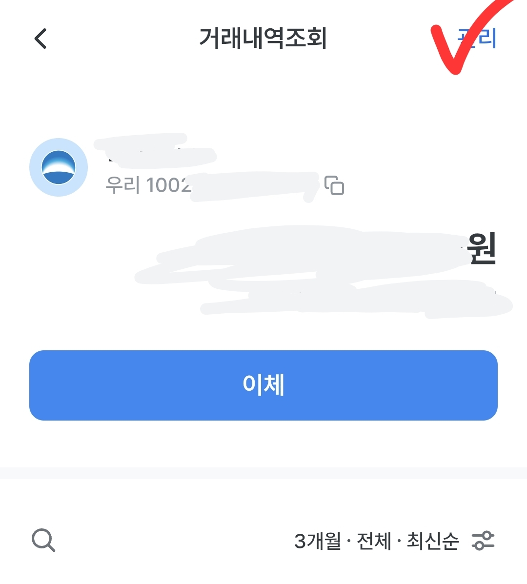 우리은행 어플을 로그인 하면 위 화면처럼 계좌가 나오는데, 조회하고 싶은 계좌를 눌러 준다.
