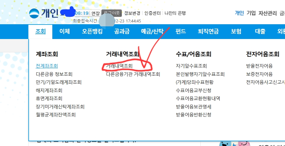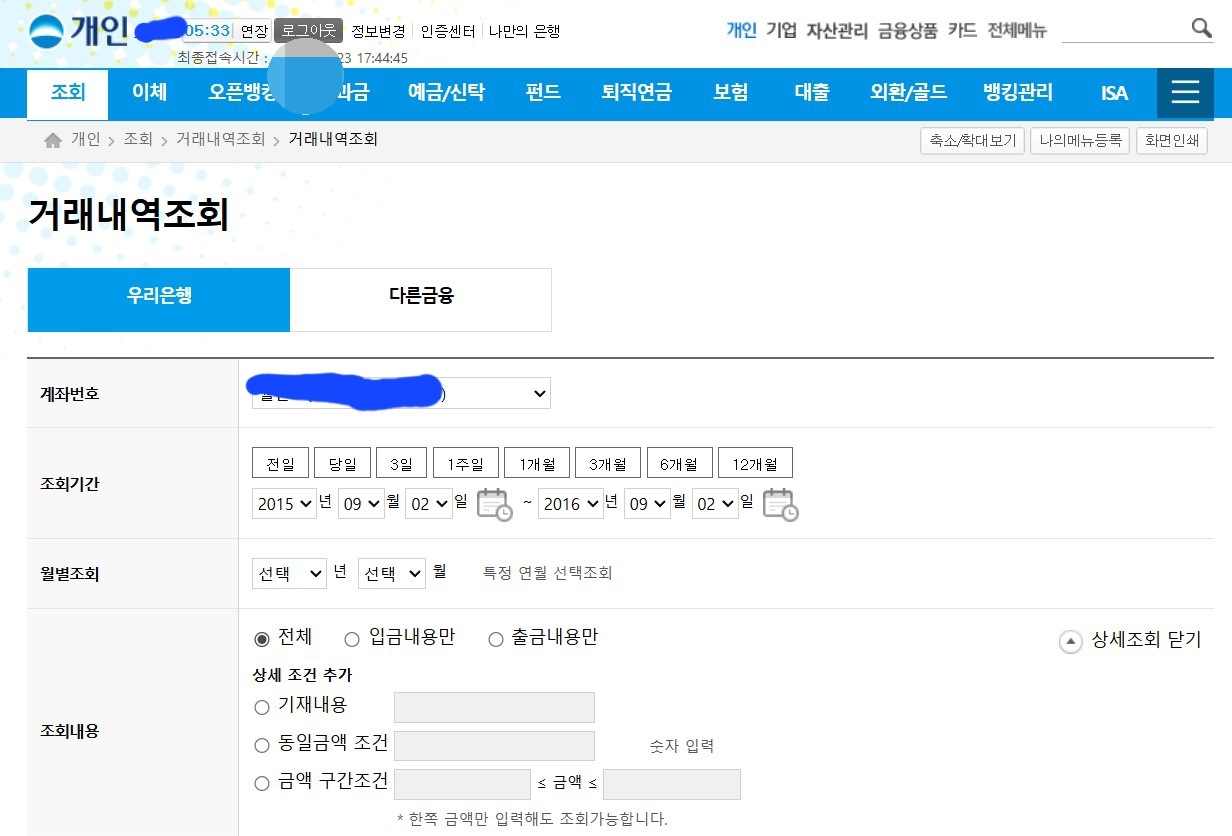 pc에서 우리은행을 로그인 한 후, 조회 카테고리에서 거래 내역 조회 메뉴에 들어간다.