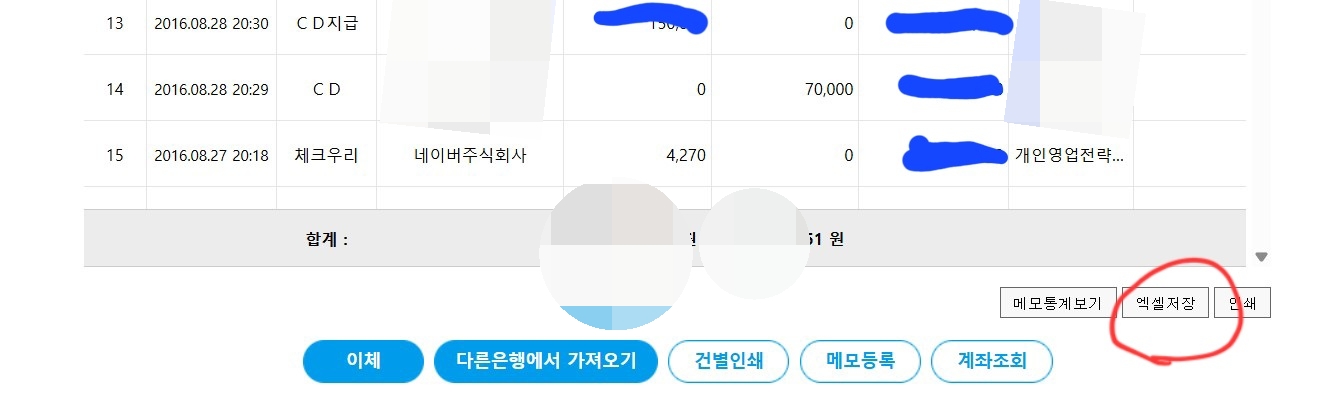 조회 내역이 목록으로 나오고 그리고 드디어 오른쪽 밑에 '엑셀 저장'이라는 버튼이 보인다.
