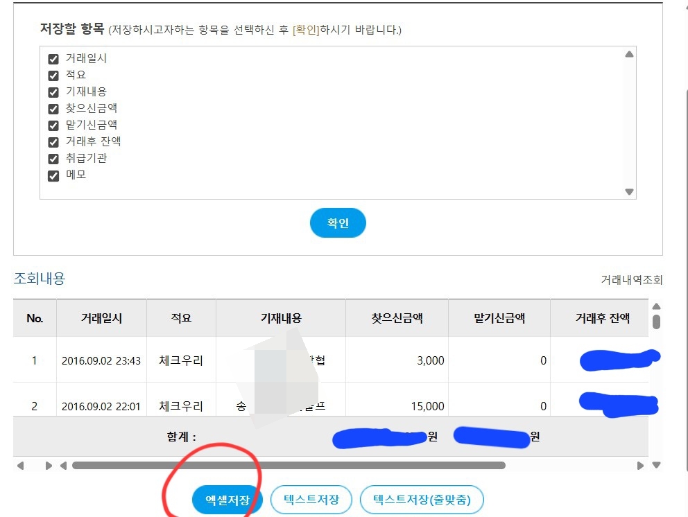 저장할 항목을 내 마음대로 체크한 뒤 엑셀저장 버튼을 누르면 1년치 거래 내역이 엑셀로 바로 다운이 된다. 모바일로 하는 것보다 훨씬 간단하고 신속하다. 특히 거래내역 조회 1,000 건 제한이 없어서, 그냥 1년씩 기간을 설정해서 다운로드 해야 된다는 것이 훨씬 편했다.