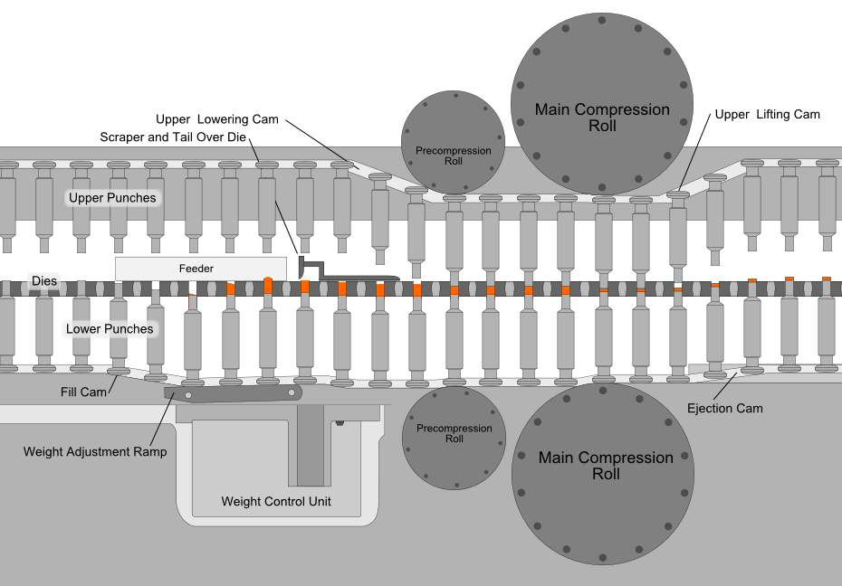 - 이 유닛에서는 목표 중량보다 높다면 유닛을 위로 올려 다이에 충전된 과립이 위로 밀려나와 scraper에 의해 깎여나가도록하고, 반대로 목표 중량보다 낮다면 유닛을 낮춰 다이에 보다 많은 과립이 충전되도록하여 일정한 중량을 die에 충전되도록 한다.