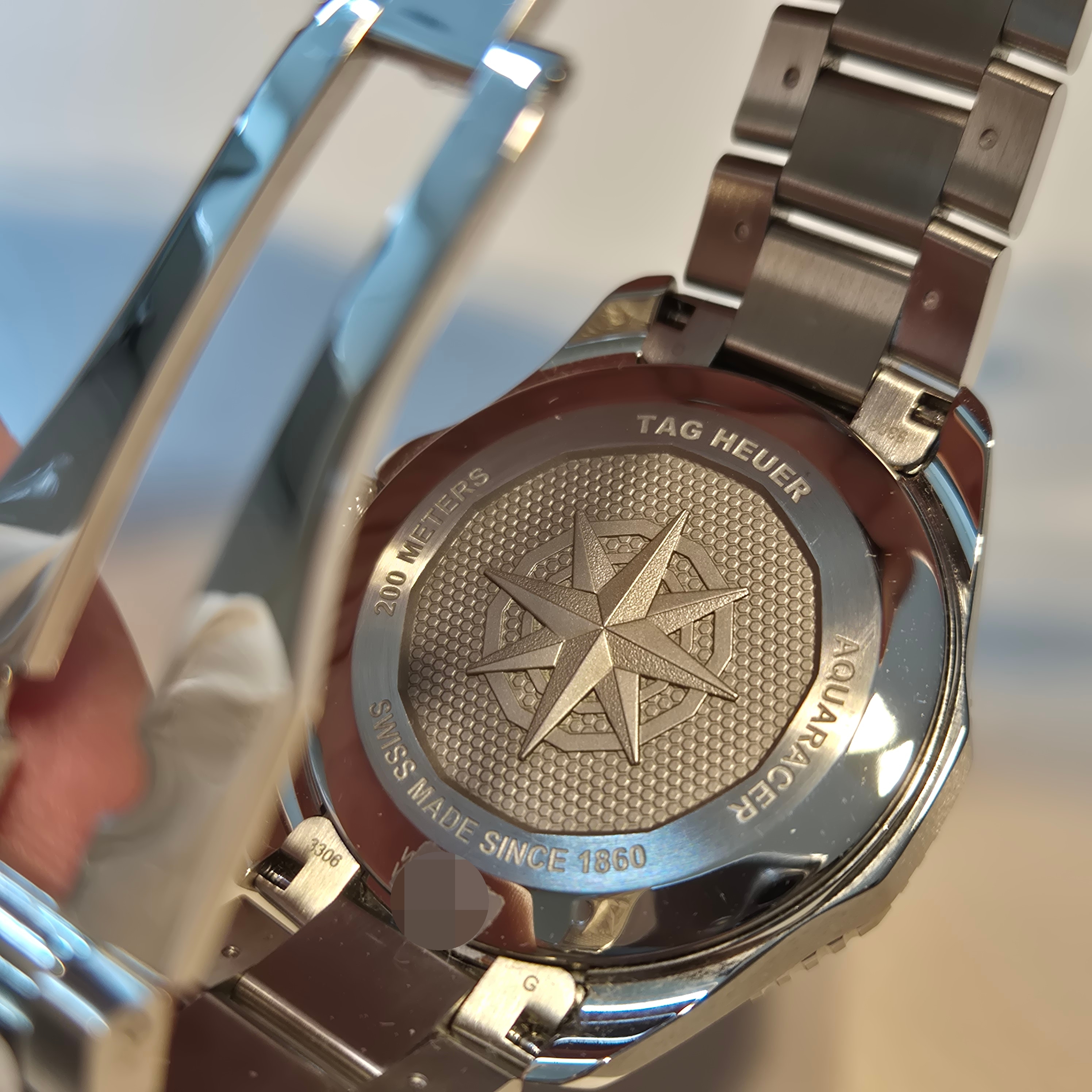 케이스백은 깔끔한 불가사리 모양이고, 간단히 방수가 200m라고 표시되어 있다.