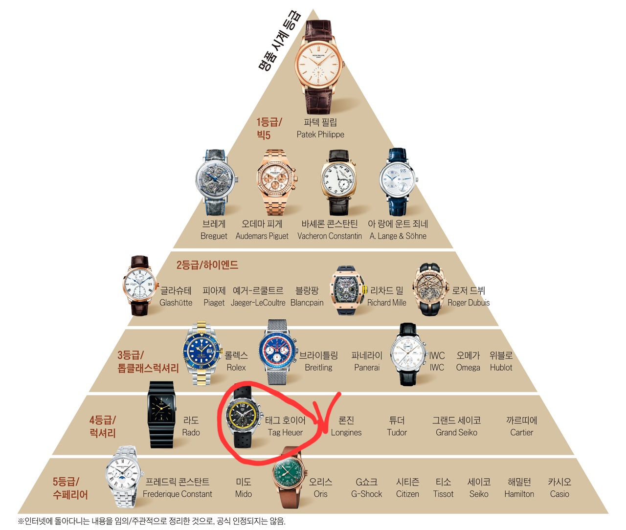 조금 널리 알려진 시계 브랜드 계급도이다. 100% 맞진 않지만 그래도 대략적인 대세의 흐름은 표현한 것 같다.