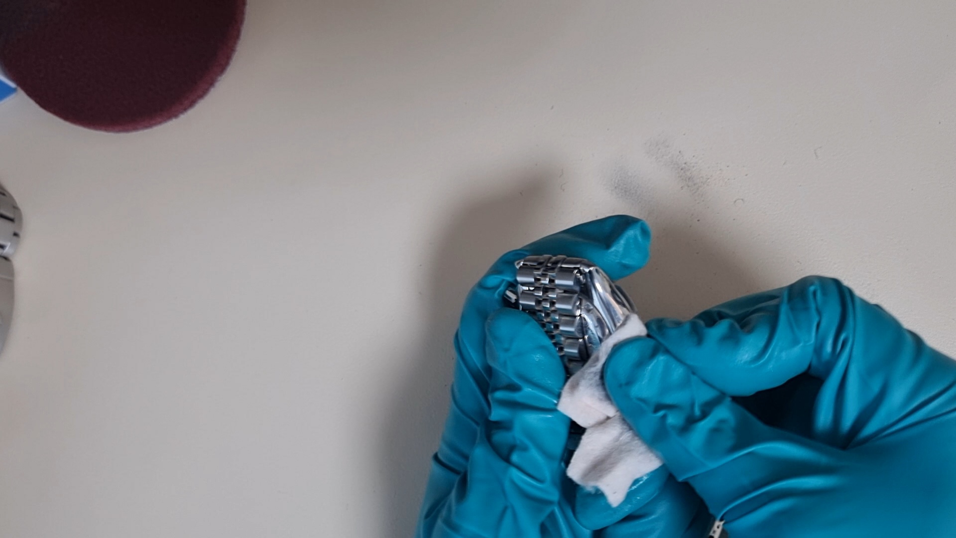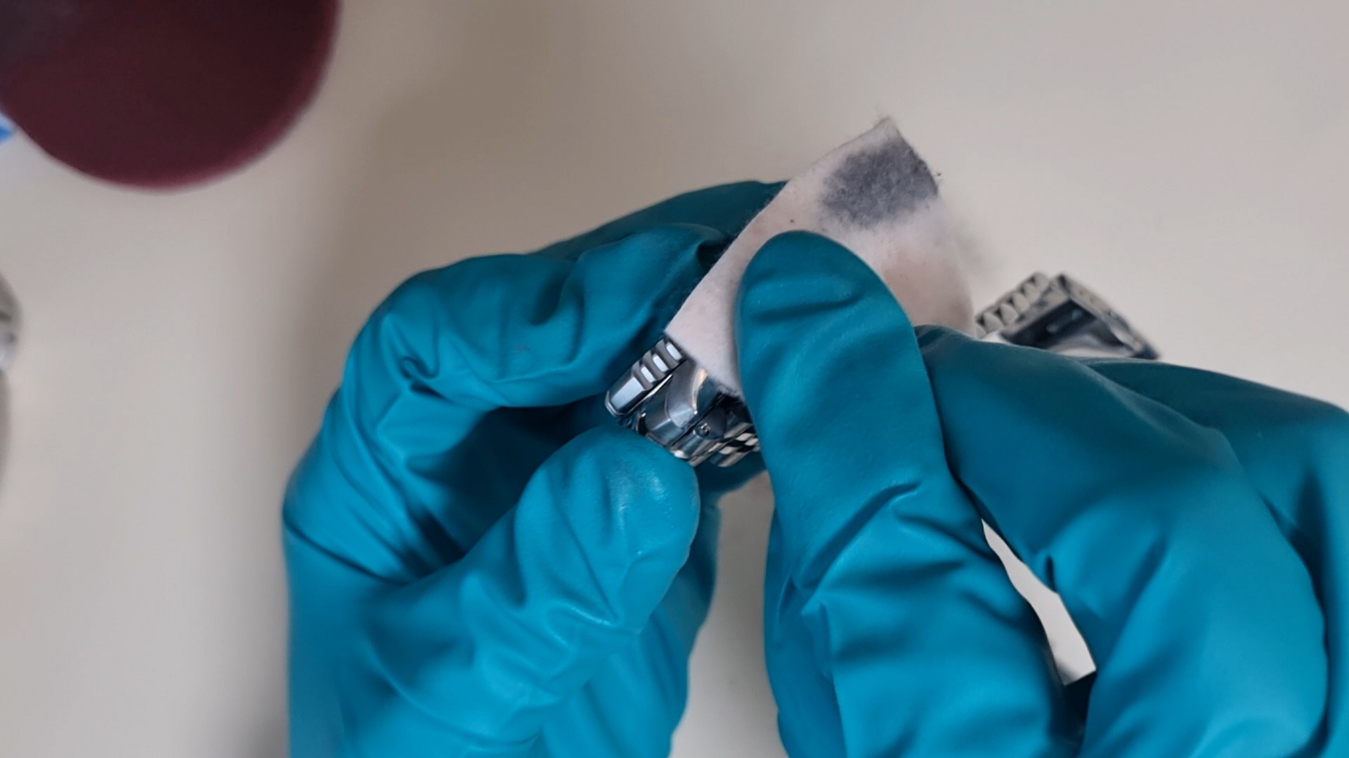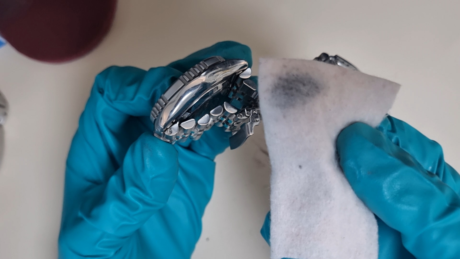 그럼 이렇게 시계 표면이 갈려서 나온 분진들이 천에 묻어 나오게 된다. 사실 폴리싱이건 브러싱이건 다 금속 표면을 깎아내서 기스를 제거하는 방법이기 때문에 너무 많이 하면은 시계 고유 디자인이 사라진다. (예를 들어 어떤 시계는 일정한 각을 줘서 모서리를 마무리한 디자인인데, 폴리싱/브러싱을 많이하면 그것이 사라진다..!)