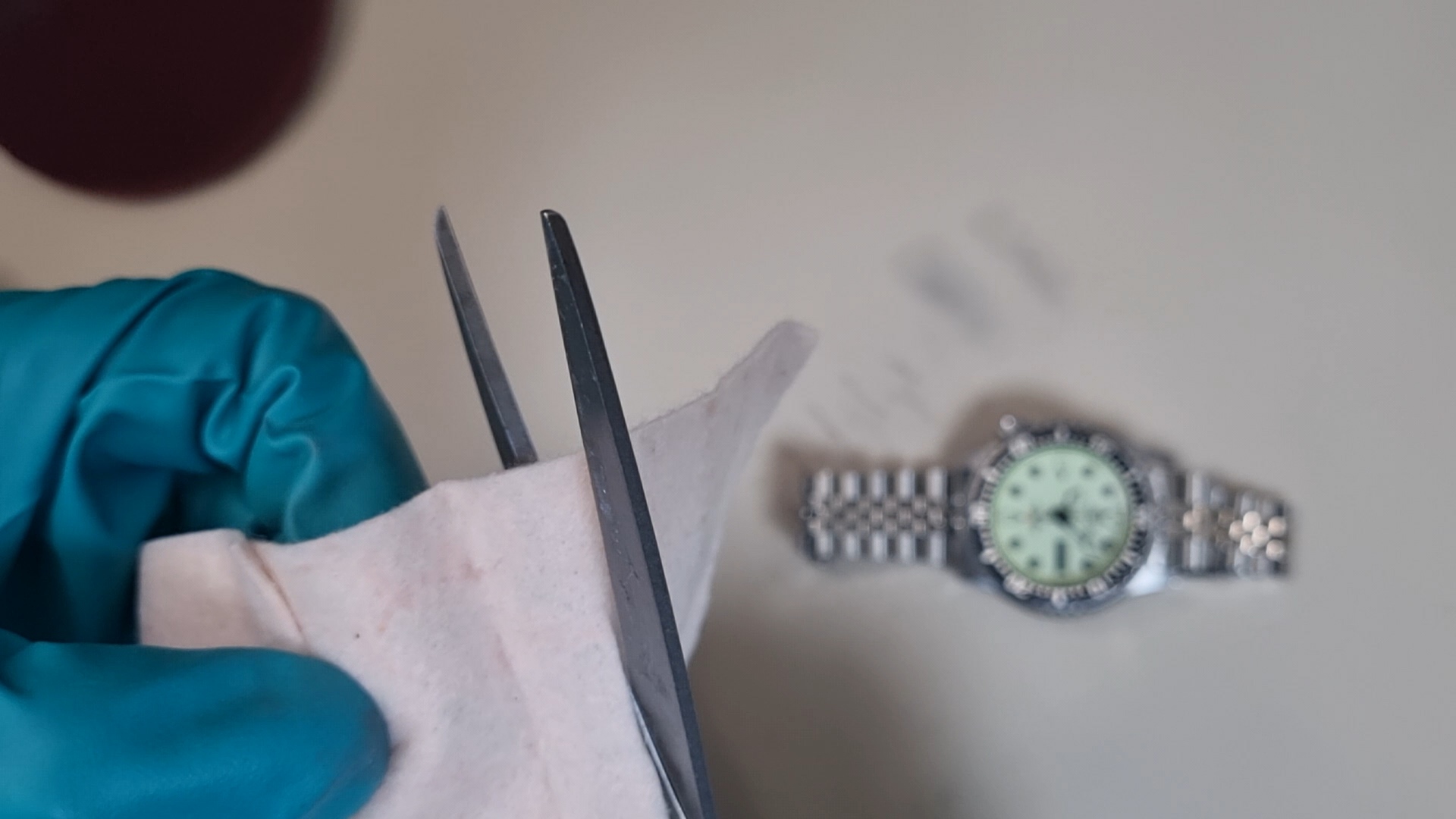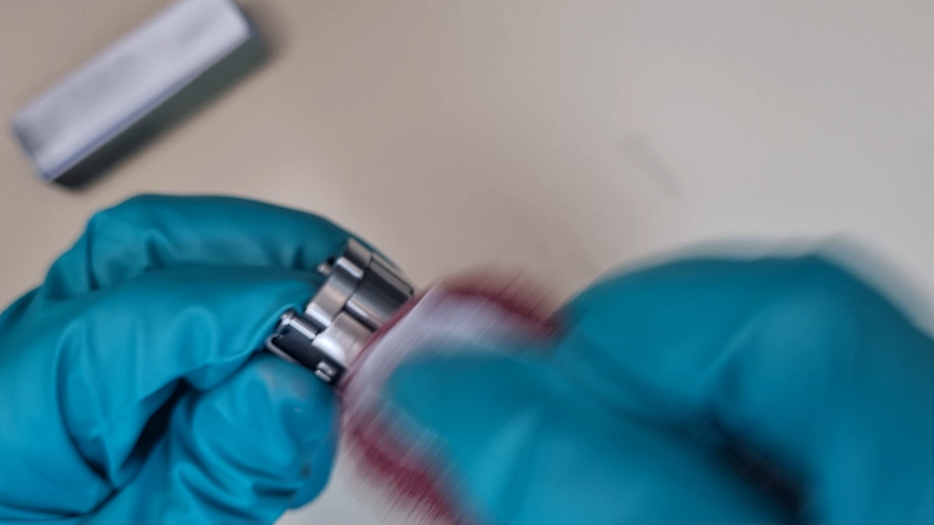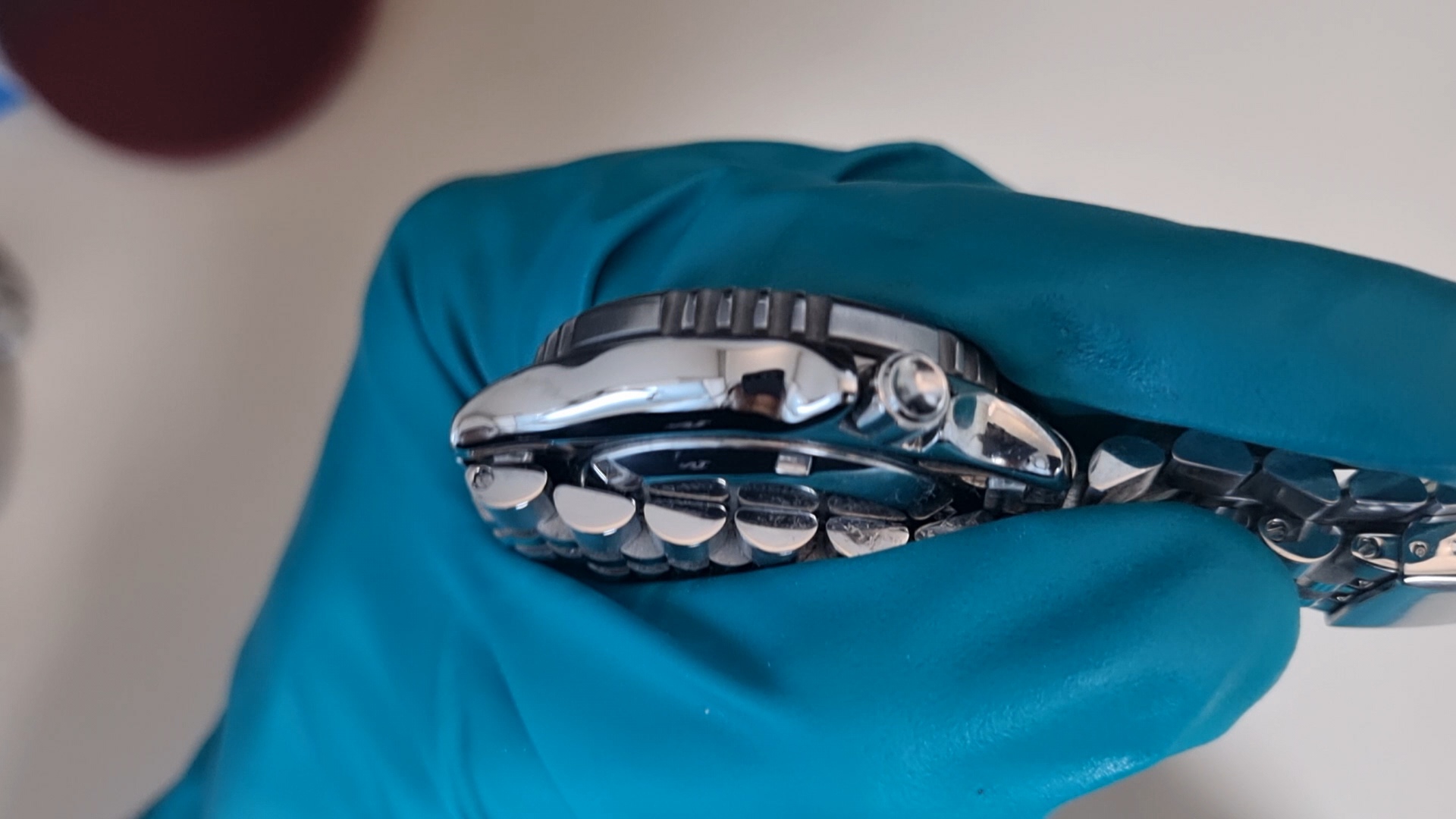 그럼 이렇게 시계 표면이 갈려서 나온 분진들이 천에 묻어 나오게 된다. 사실 폴리싱이건 브러싱이건 다 금속 표면을 깎아내서 기스를 제거하는 방법이기 때문에 너무 많이 하면은 시계 고유 디자인이 사라진다. (예를 들어 어떤 시계는 일정한 각을 줘서 모서리를 마무리한 디자인인데, 폴리싱/브러싱을 많이하면 그것이 사라진다..!)