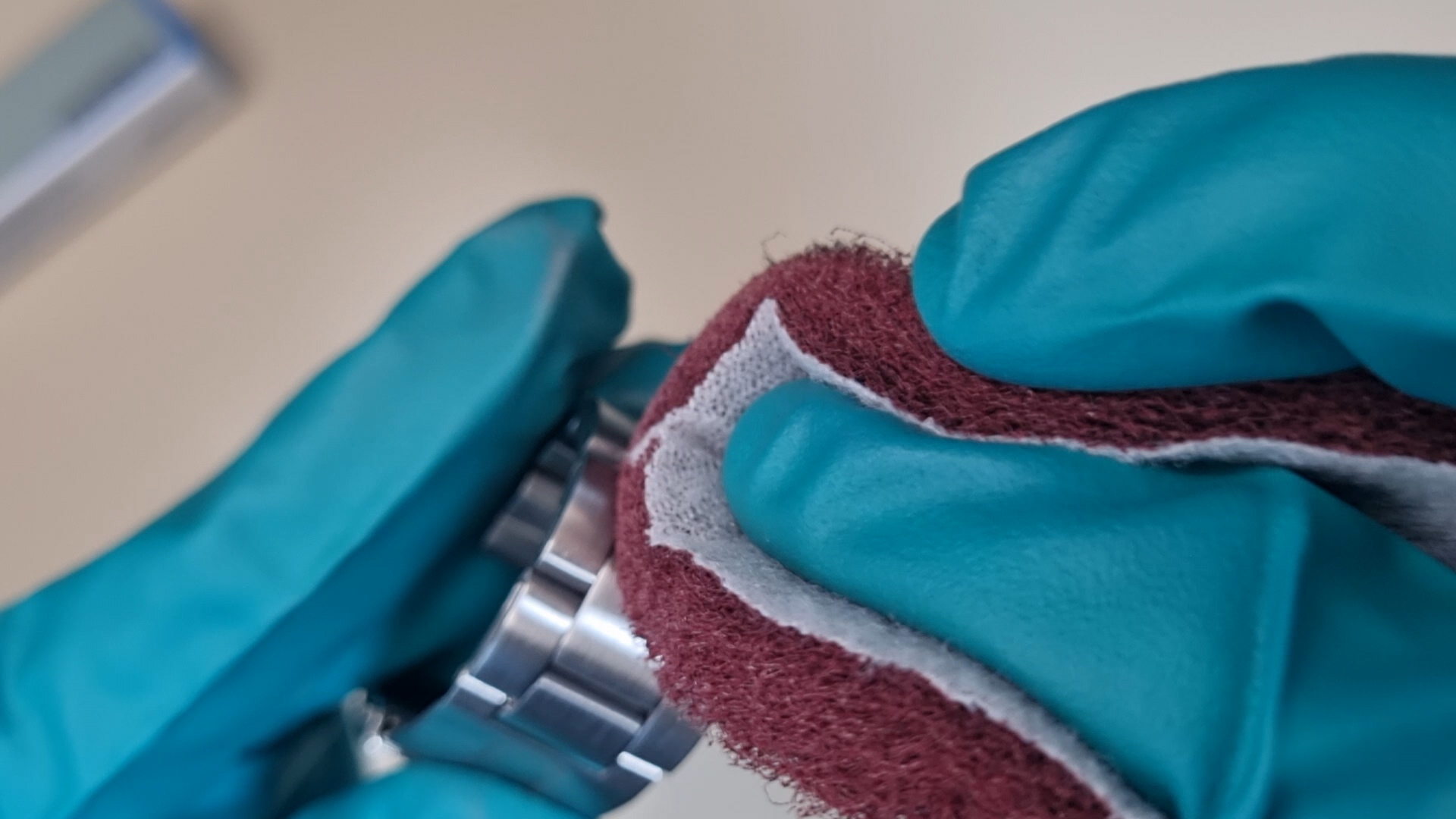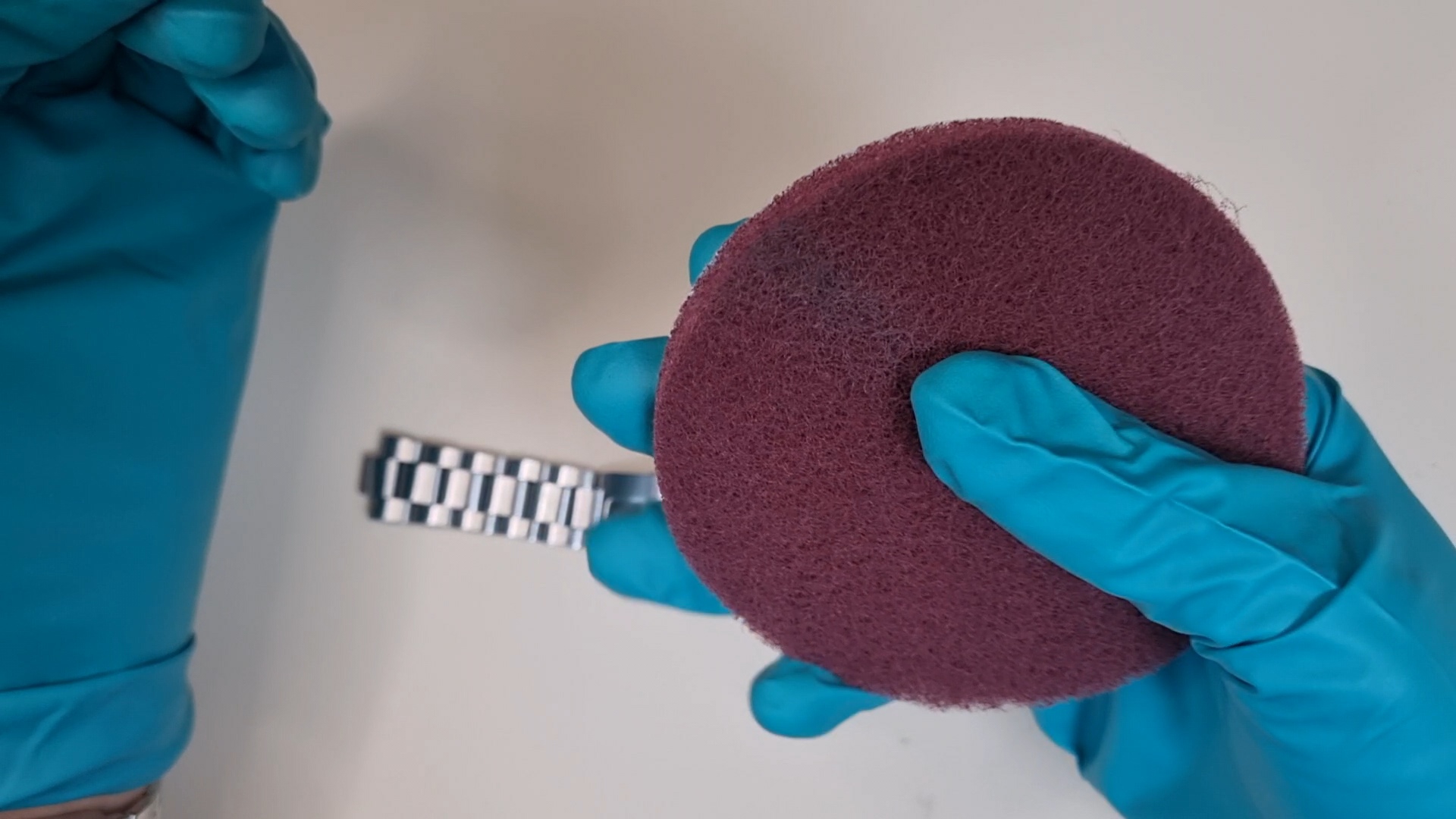 그래서 나는 이 수세미로 브러싱, 즉 시계 기스 제거를 해 본다.