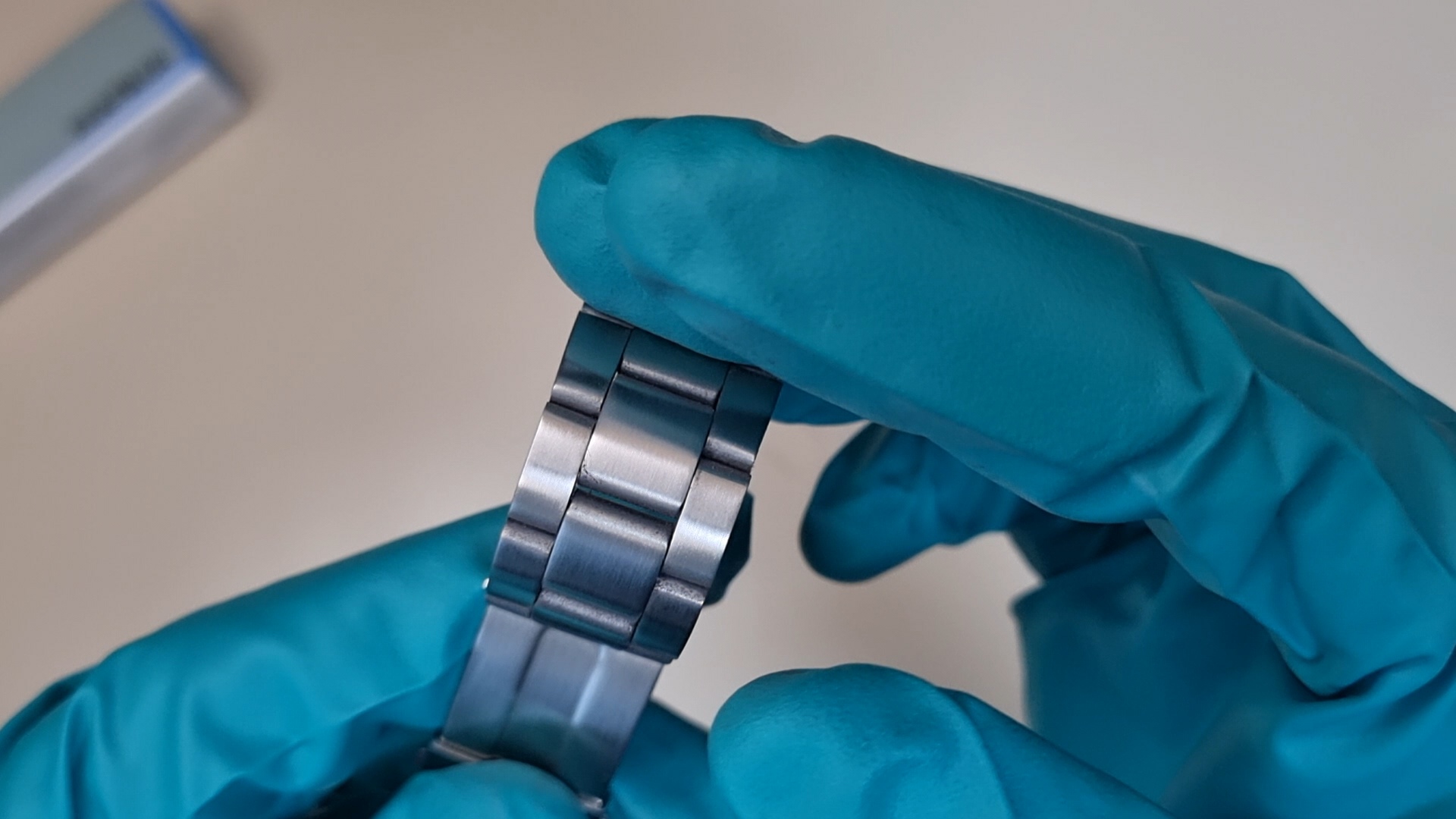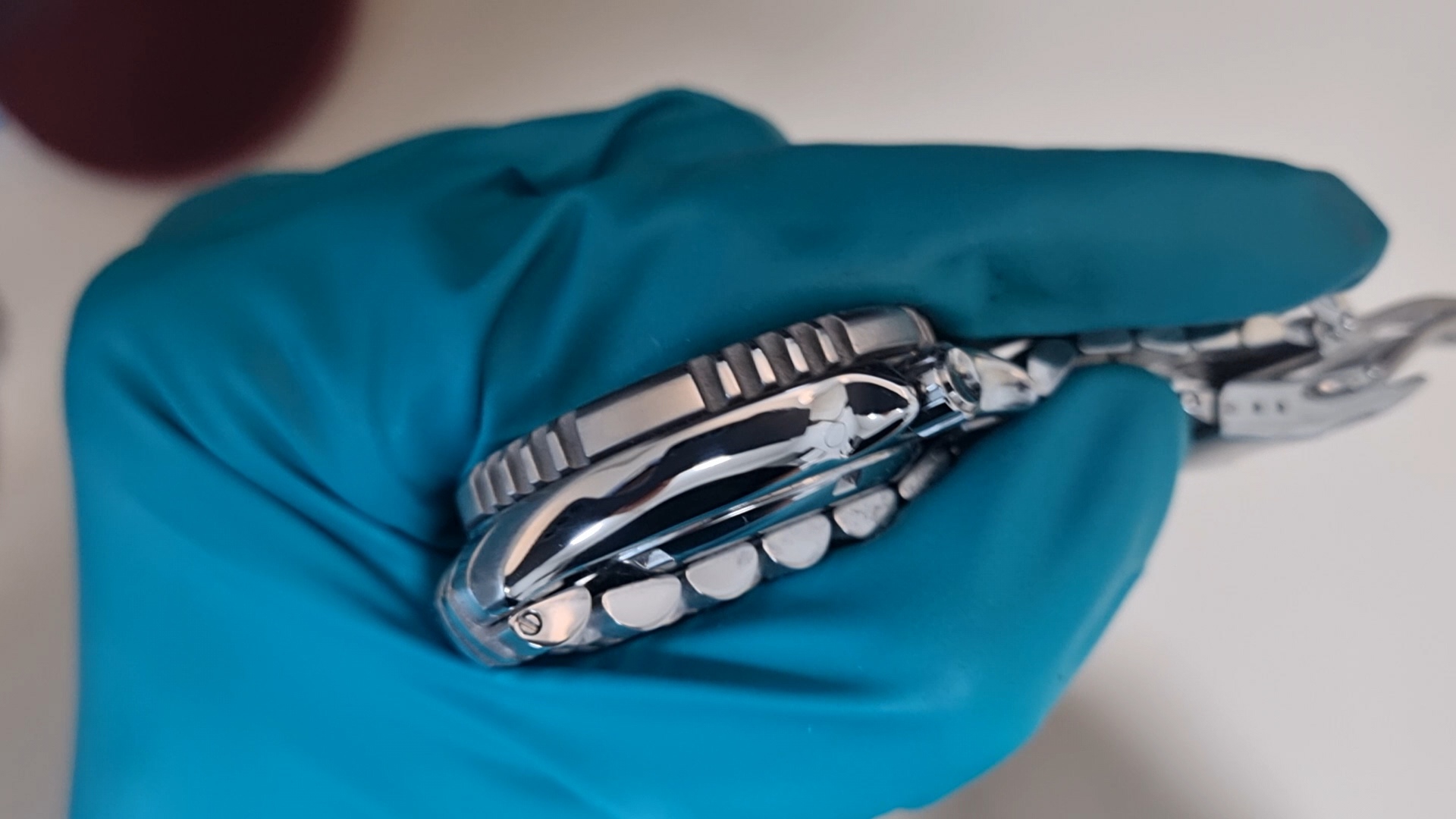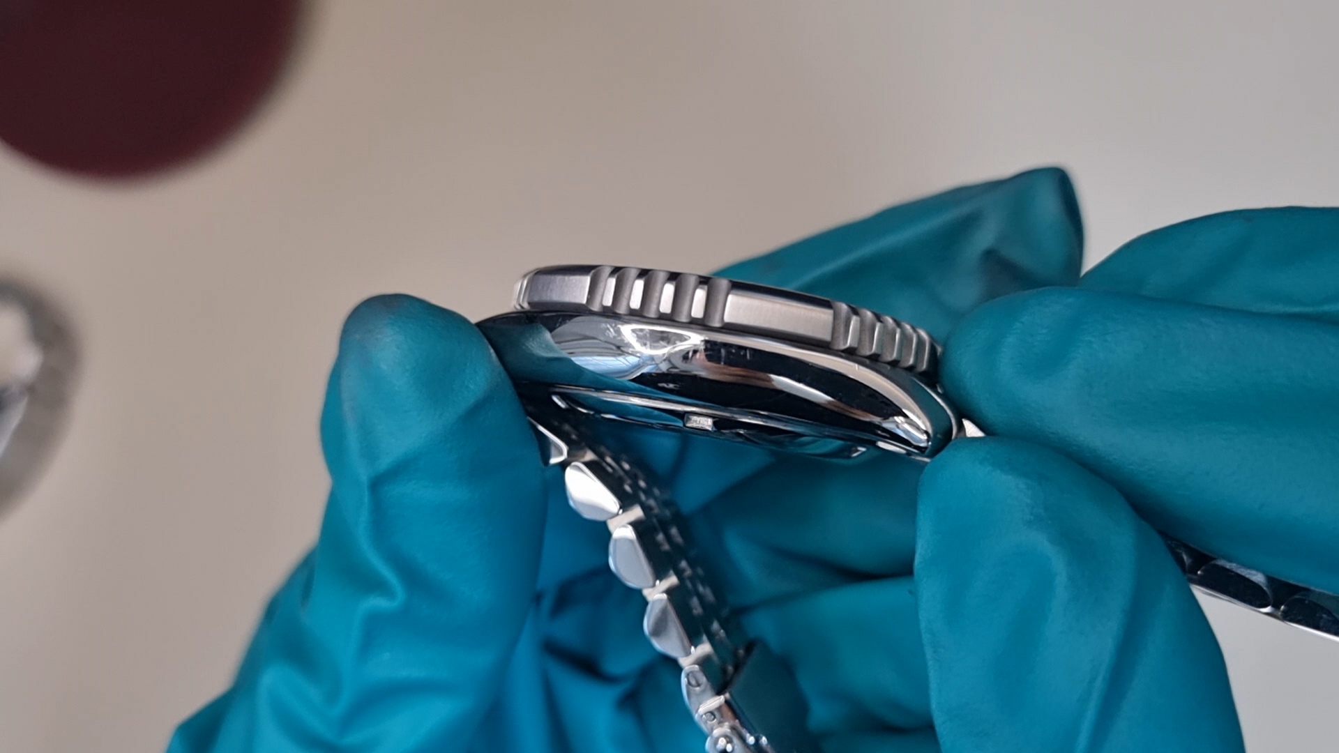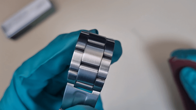일단은 시계는 두 가지 표면을 갖고 있는데, 첫 번째는 위 사진의 시계 케이스(몸체)처럼 거울처럼 반사되는 폴리싱 표면이다. 그리고 두 번째는 거울처럼 반사되진 않지만 일정한 결을 갖고 있는 위 사진의 시계줄과 같은 마감이다.