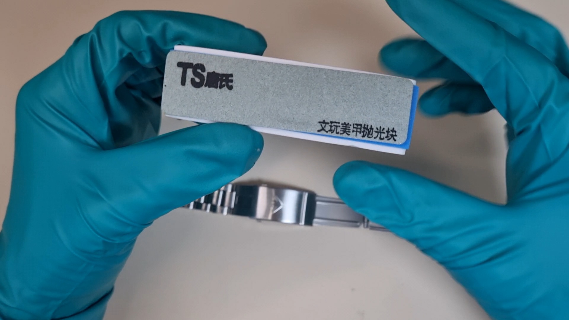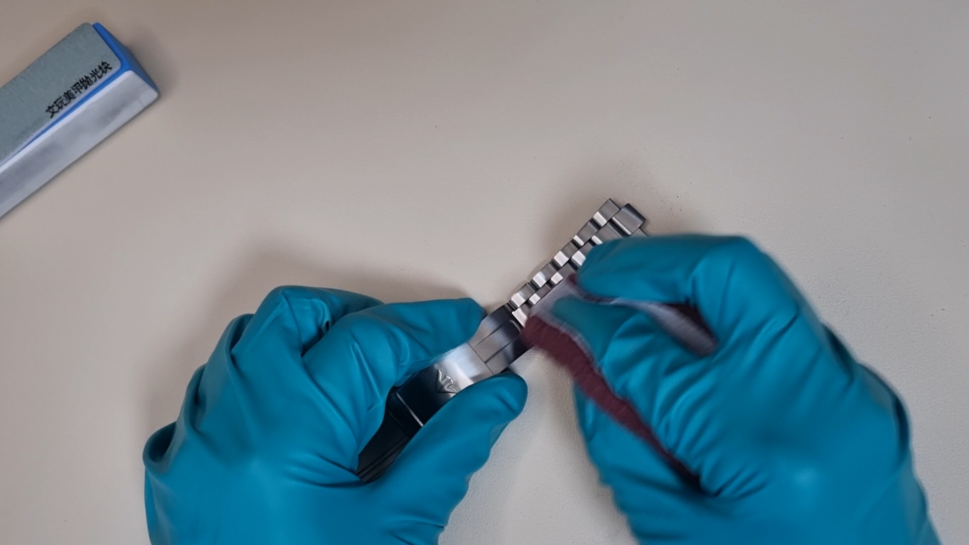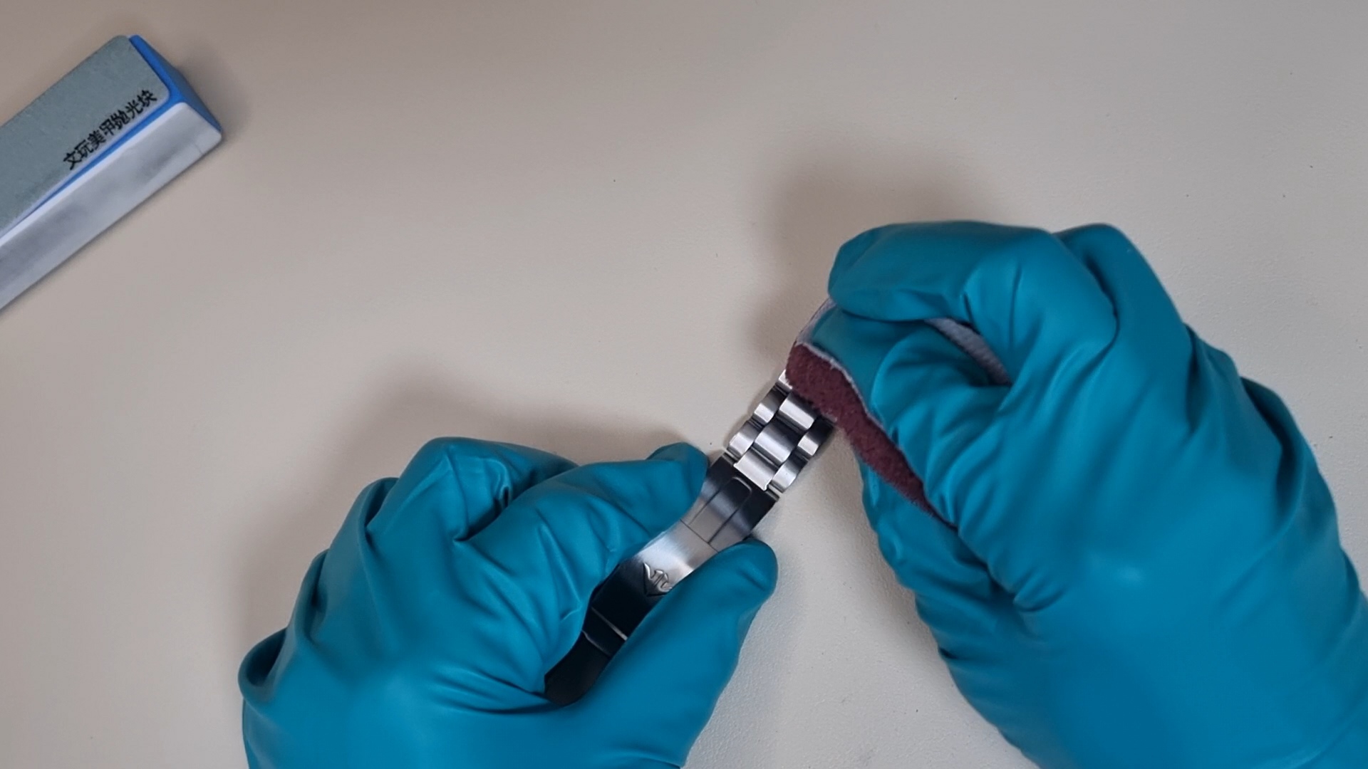 두 가지 수리 방법이 약간 다르니 먼저 일정한 결을 갖고 있는 시곗줄의 기스를 제거해 보자.
