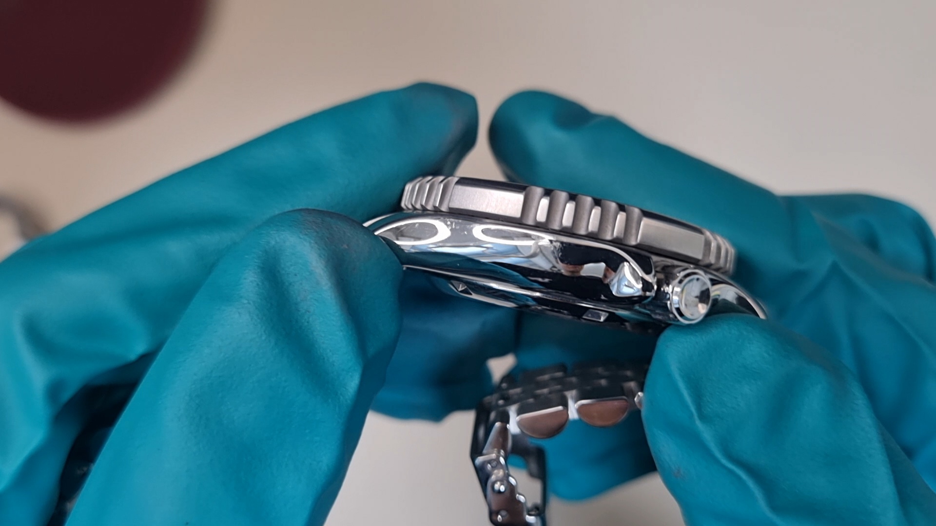 시계 케이스도 이렇게 자글자글한 기스가 생기기 마련이다. 이러한 스크래치는 나와 함께 시간을 보낸 이 시계의 역사로 볼 수 있으나 보기에는 안 좋은게 사실이다..
