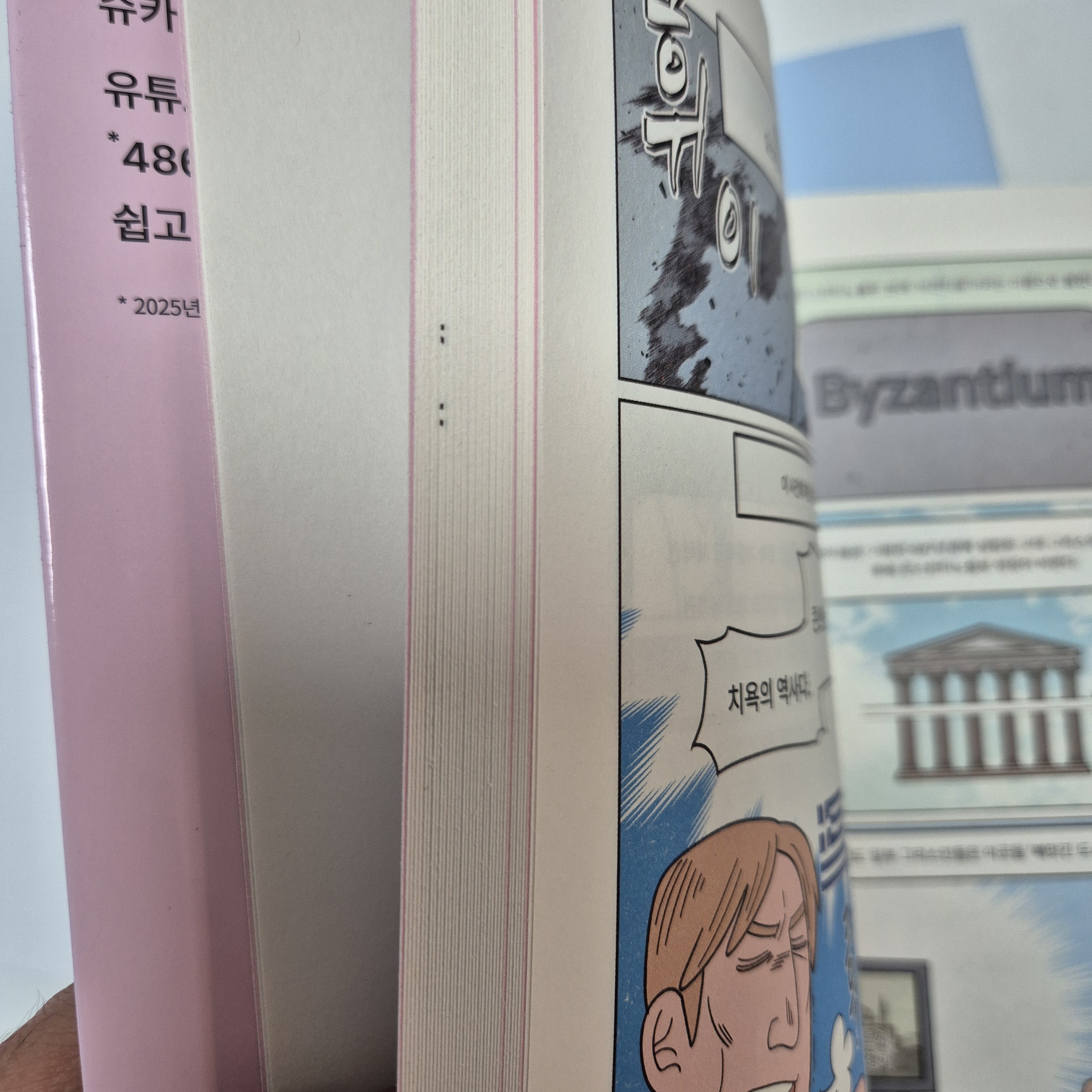 만화와 글의 비율은 책의 옆면을 보면 확연히 드러난다. 저 핑크색이 만화와 글을 나누는 속지인데 저 정도 비율로 책이 구성되어 있다.
