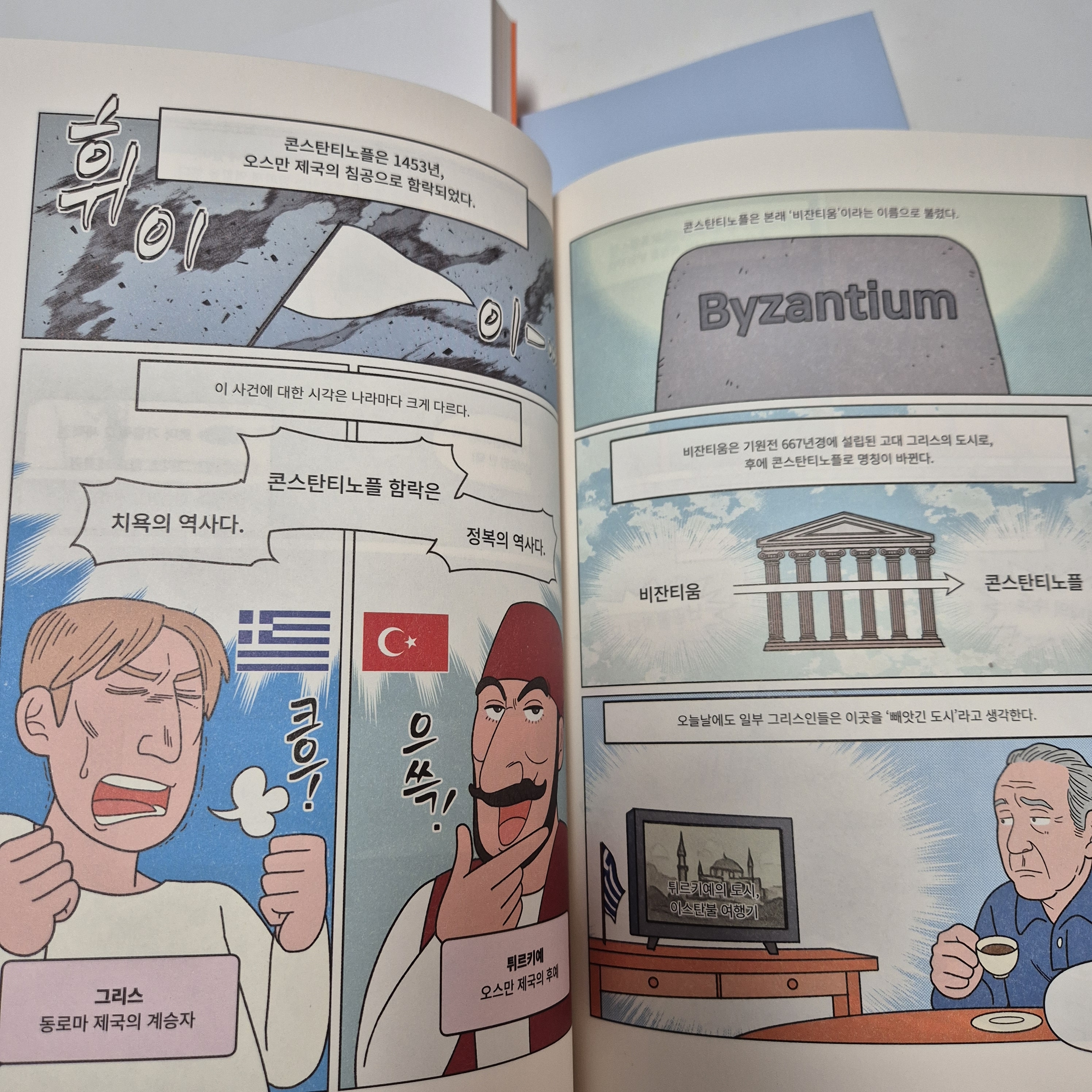 책을 펼쳐 보면 처음부터 이렇게 만화가 나온다. 슈카월드 방송을 보면 슈카가 가끔 '먼 나라 이웃나라' 이야기를 하는 것을 볼 수 있는데, 이 책도 그 먼 나라 이웃나라의 영향을 많이 받은 듯하다. 왠지 그림체도 좀 비슷하고 구성도 비슷하다.