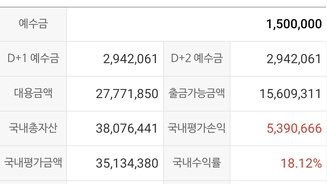 또 국내총자산은 38,076,411 원인데, 국내평가금액이 35,134,380이니, 내 현금은 2,942,031(38,076,411 - 35,134,380) 원 인가? 그럼 출금가능금액은 내 자산이 아닌가?