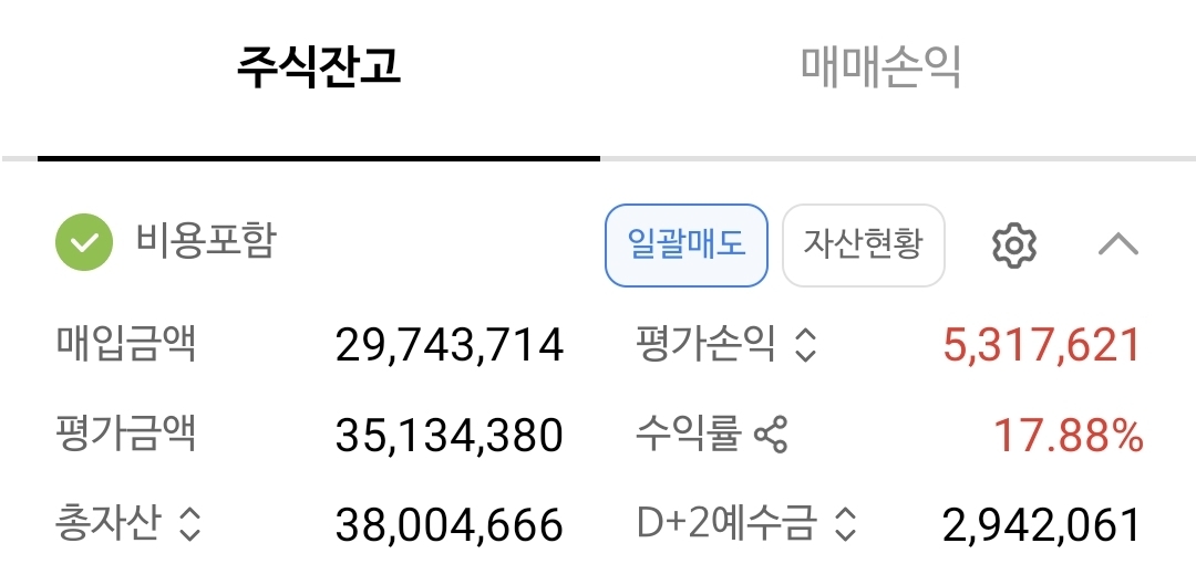 주식잔고를 확인하면 총자산은 38,004,666 원으로 예수금 조회화면에서 나타난 국내총자산은 "38,076,411 원"과 비슷하다.(왜 정확히 안맞는지는 모르겠다..약 7만원 차이)