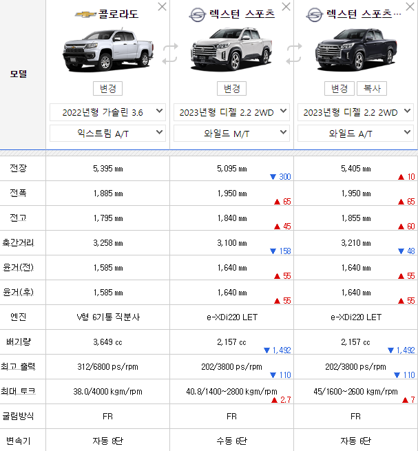 국내 유일하게 콜로라도와 비교할 수 있는 렉스턴스포츠와 렉스턴스포츠칸과 제원비교를 해보았습니다.