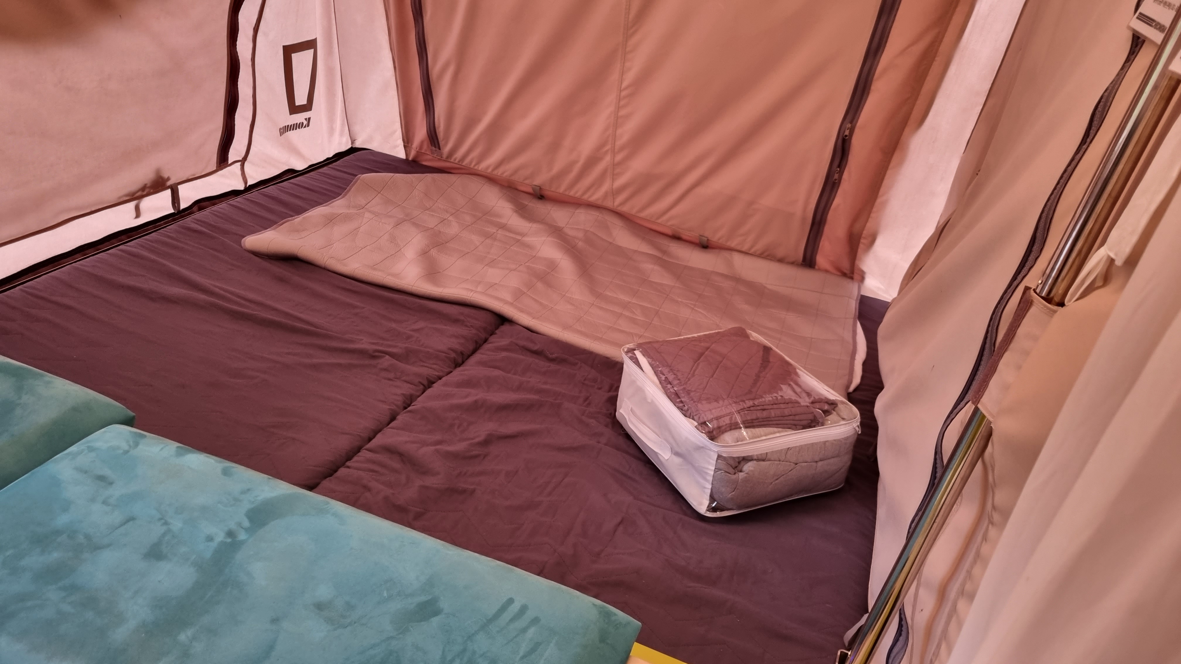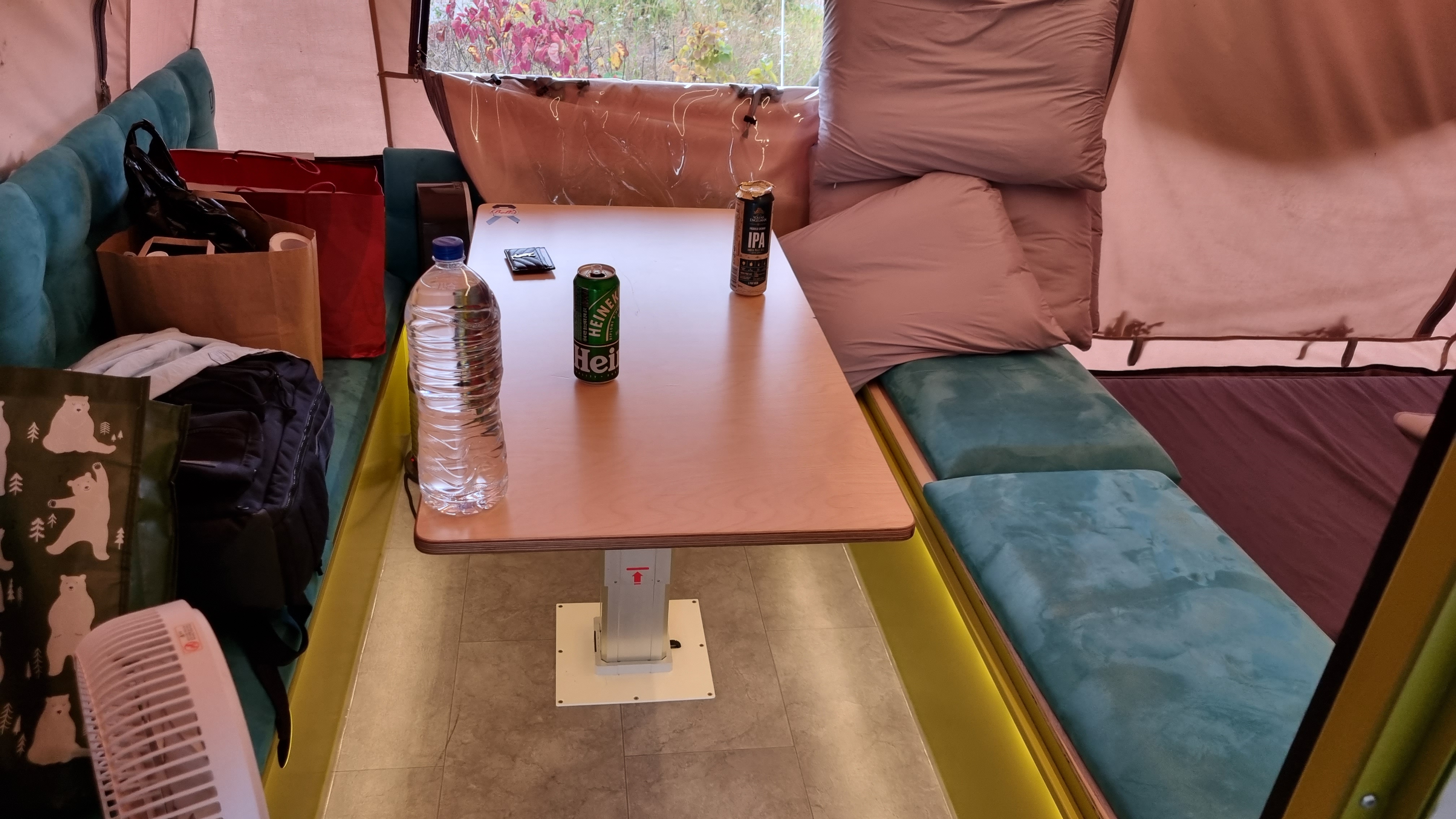 둘이 눕기 충분한 공간이었고, 인원이 더 있다면 테이블과 소파 있는 자리를 조작해서 침대로 만들어 2명은 추가로 누울 수 있습니다.