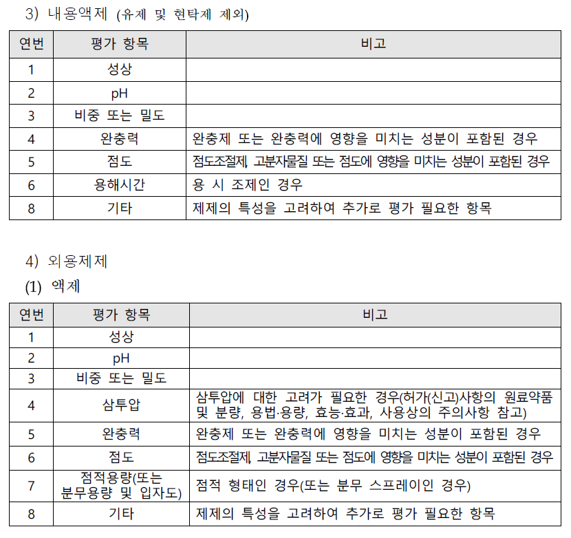 또한, 비고란에 예시든 항목이 내 제품과 관련이 있다면 역시나 필수적이다.(예: 원약분량에 HPMC가 부형제 목적으로 들어갔어도, HPMC의 특성상 점도에 지대한 영향을 끼치므로 점도 항목이 평가 항목으로 포함되어야 한다)