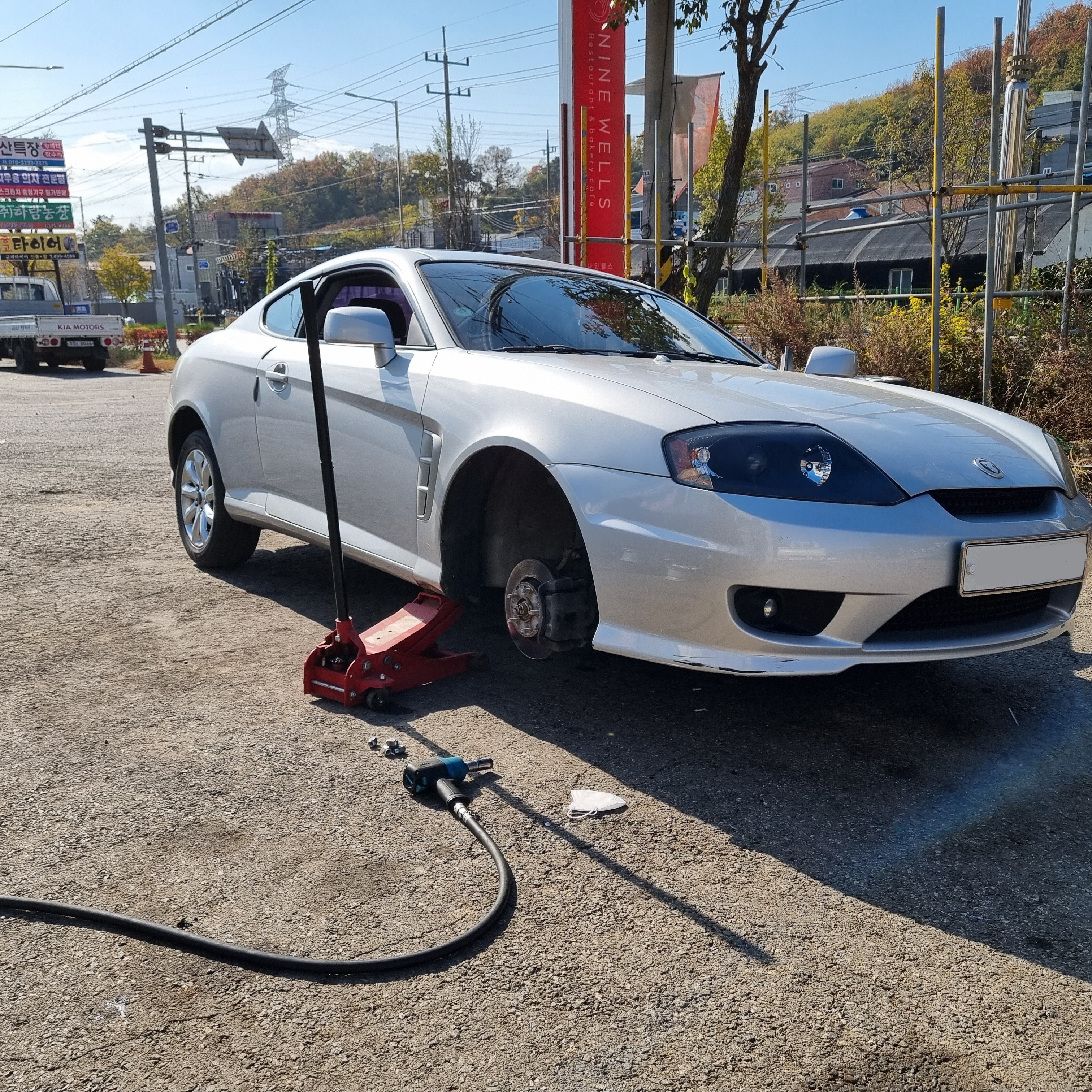 일단 드리프트 타이어처럼 맨들맨들해진 타이어를 바꿔줍니다. 차 값이 백만원대이다보니 좋은 신품 타이어를 낄 엄두가 안나 22년식 중고타이어를 껴줬습니다.