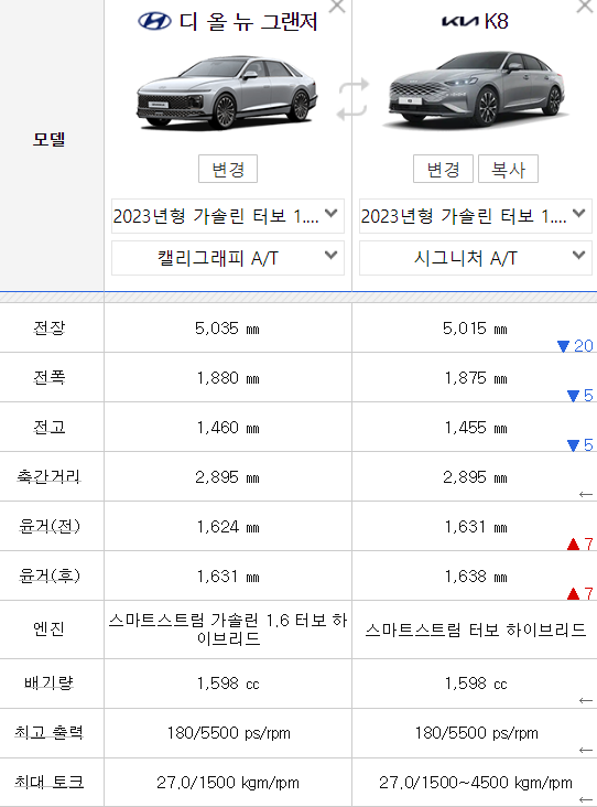 일단 엔진은 둘다 1,598cc 터보로 동일하고, 차량 크기는 그랜저가 전장/전폭/전고 다 조금씩 큽니다.