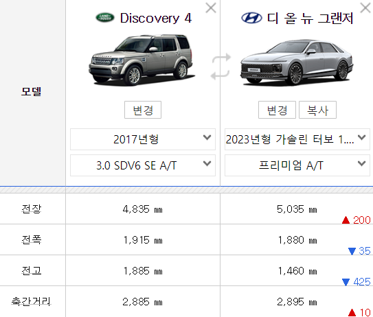 네 차폭은 1915 vs 1880으로 역시 그래도 디스커버리가 더 컸습니다.