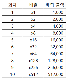 즉, 내가 만회할 때까지 돈을 2배씩 때리부어서 1번만 이기면 그동안 진것을 다 만회하고 기본 베팅액(1000원)을 벌게 되는 것이다.