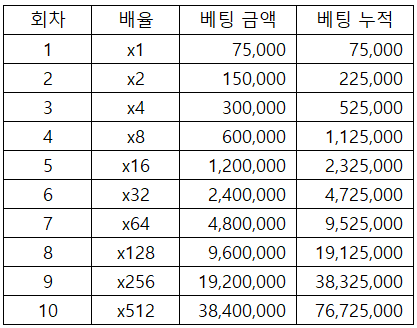 즉, 내가 만회할 때까지 돈을 2배씩 때리부어서 1번만 이기면 그동안 진것을 다 만회하고 기본 베팅액(1000원)을 벌게 되는 것이다.