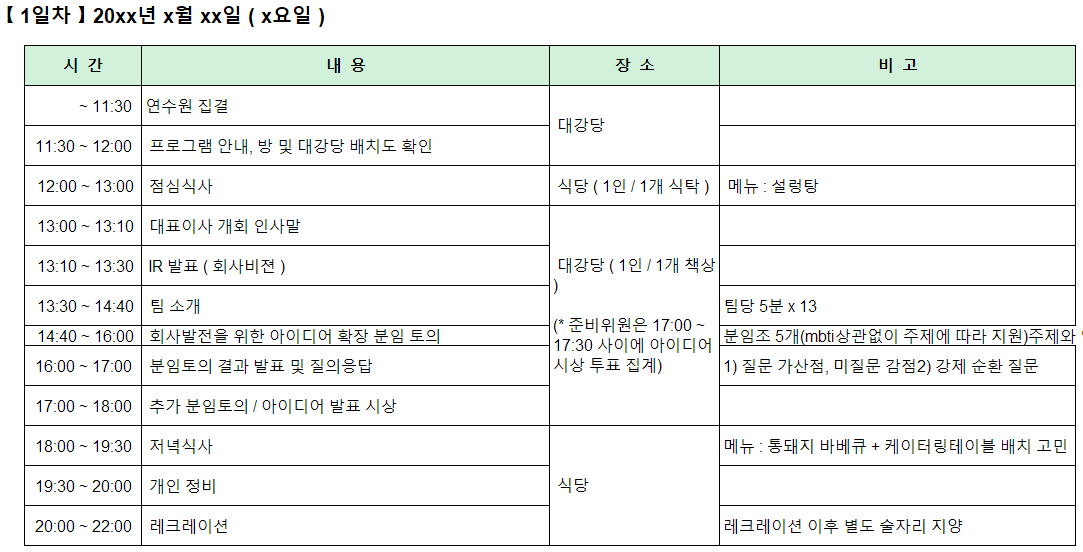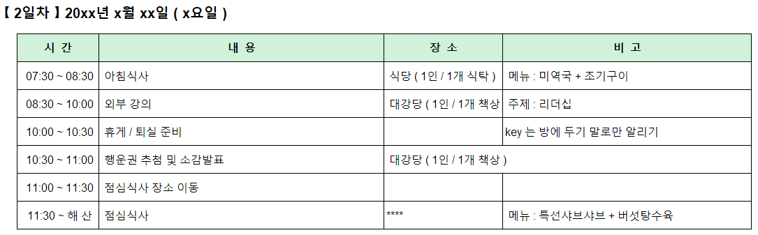 | 회사 워크숍 준비(일정, 프로그램, 준비물)-2 (0) | 2023.02.09 |