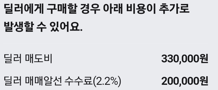 약 50만원 정도인데.. 중고차가 오래되어 가격이 저렴할수록 차값 대비 수수료가 너무 커집니다.