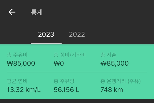 2022년 초반엔 새로 구매해서 신나서 열심히 밟기도 했지만, 2023년엔 기름게이지가 떨어지는게 눈에 보여 무서워 연비운전을 좀 한 것 같습니다.