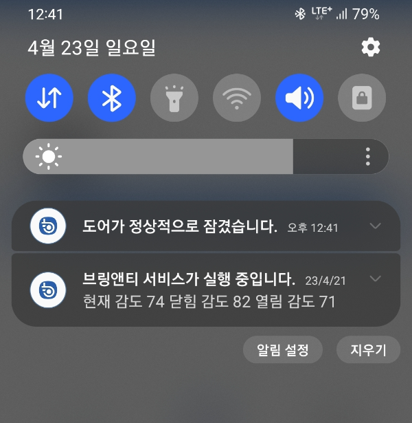 알림창에 항상 "브링앤티가 실행중입니다"라는 알림과 "도어가 정상적으로 열림과 잠김"을 알림창에 아래 사진처럼 알려준다.(왼쪽)
