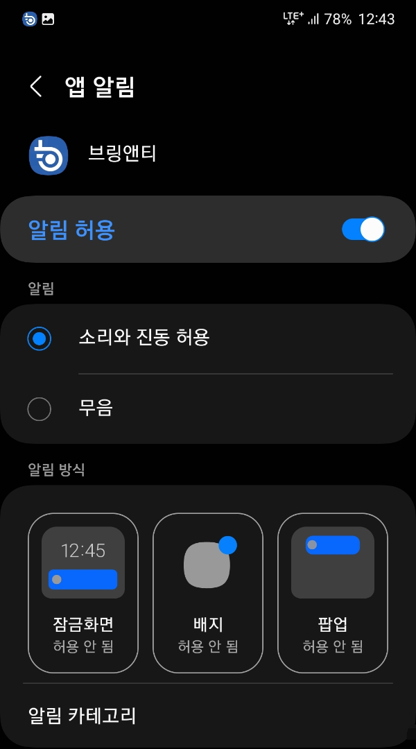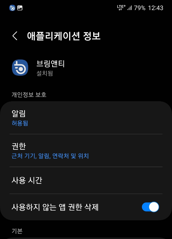 알림허용 저걸 비활성화하면 브링앤티가 정상작동 안한다고하니, 일단 놔두고.