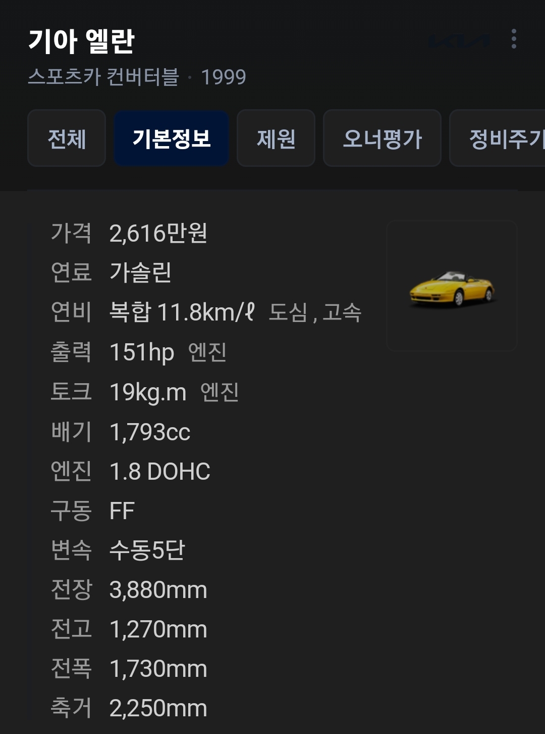 기아 엘란은 전륜구동이었지만, 지금까지도 우리나라에서 국산차로는 출시된적이 없는 컨버터블이다. 소프트탑이지만 지금봐도 정말 멋지다.