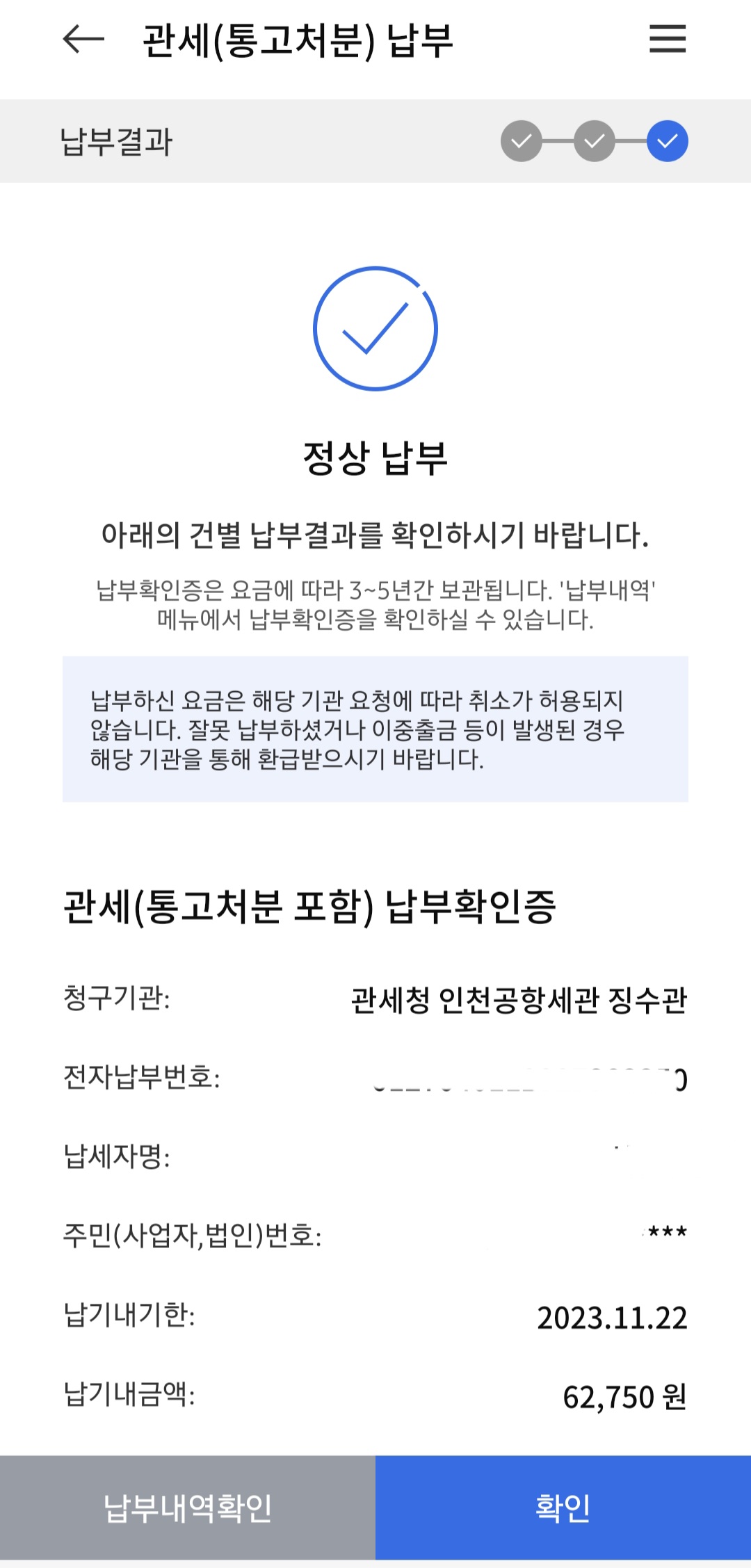 눌러서 조회해보면 "관세청 인천공항세관"에 금액이 뜨네요.