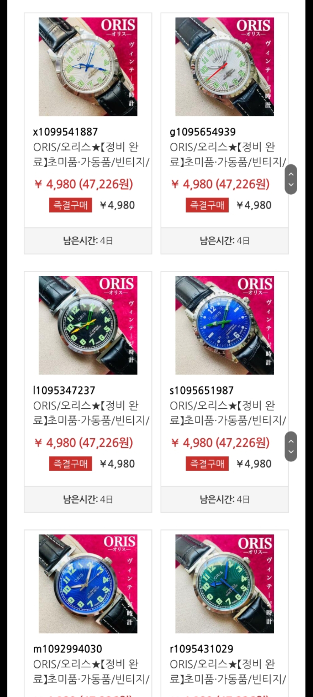 그리고 확신을 갖게되었던 이유는 바로, 옥션에서 무제한으로 팔리고 있는 "ORIS 17 jewels shock proof "를 보았기 때문이다. 처음에 오리스를 발견했을 때는 이렇게 많은지 몰랐는데, 정신차리고 오리스로 가격대순으로 검색하니 비슷한 가격에 엄창난 매물이 있었다. 그리고 모두가 다이얼 디자인은 달랐지만, 모두 같은 사이즈에 동일한 무브먼트, 그리고 매우 좋은 컨디션을 갖고 있다는 공통점이 있었다. 아무리 오리스가 많은 디자인은 과거에 뽑아 냈다고 해도 이렇게 모두가 컨디션이 한결같이 좋다는 건 말이 안됐다.. 사실 가격부터가 말이 안됐던거 같다ㅜ