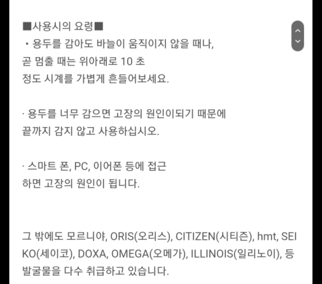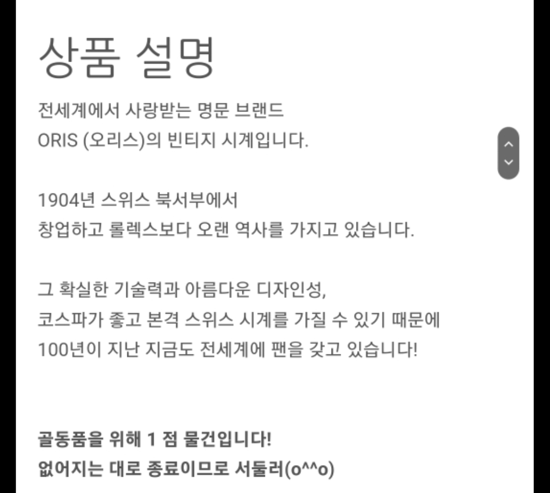 롤렉스보다 오래된 역사를 가진 위대한 오리스에 대한 설명과, 골동품으로 미세한 상처가 있다는 디테일..