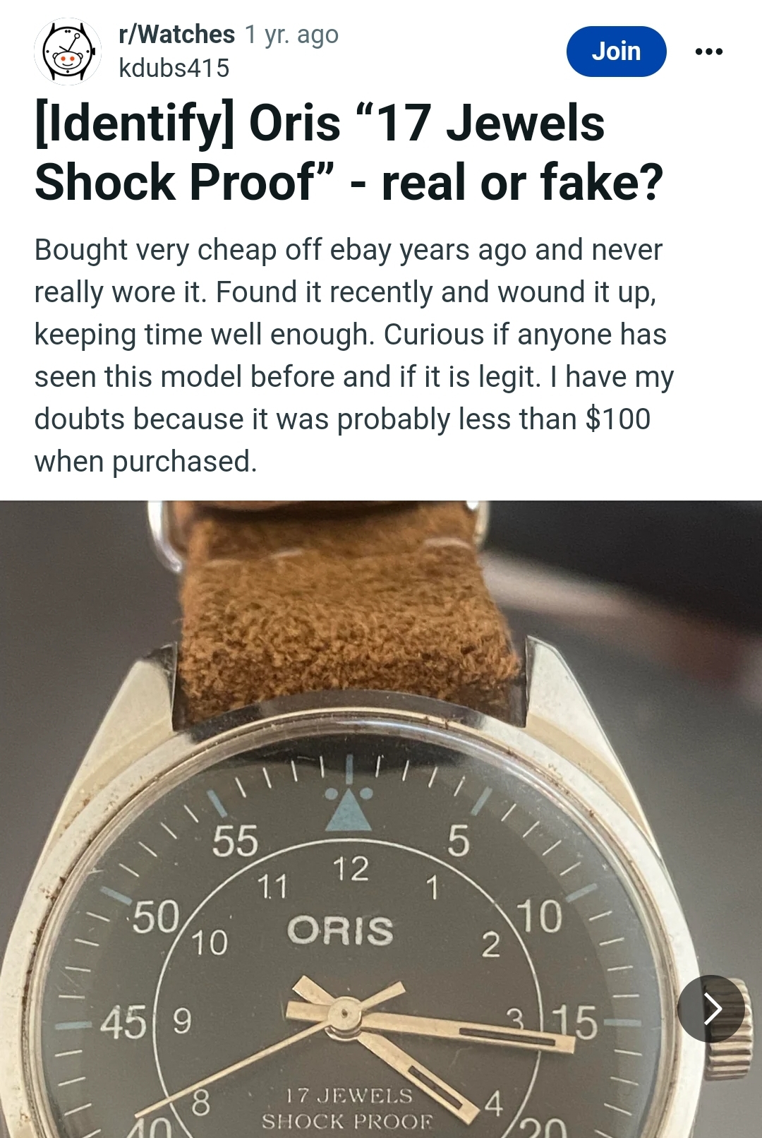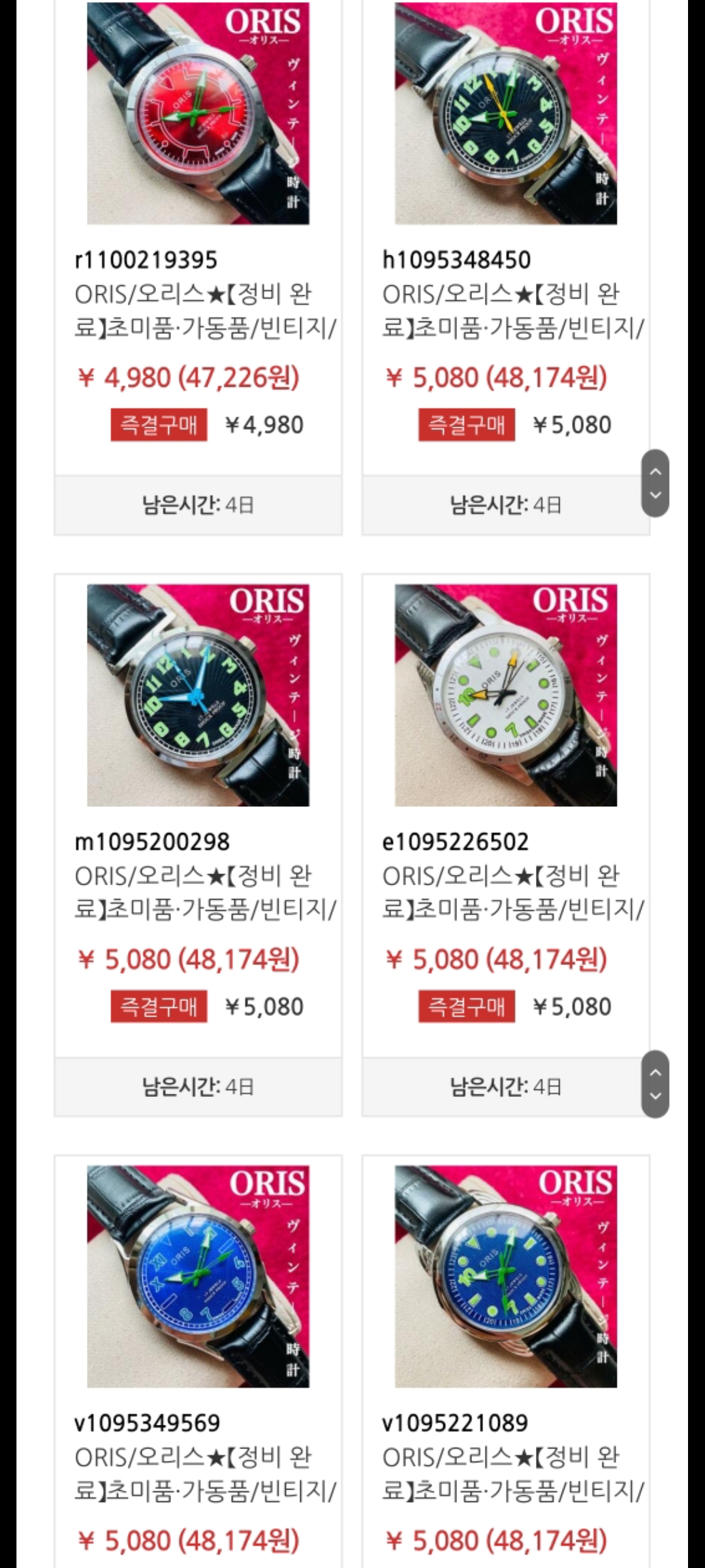 그리고 확신을 갖게되었던 이유는 바로, 옥션에서 무제한으로 팔리고 있는 "ORIS 17 jewels shock proof "를 보았기 때문이다. 처음에 오리스를 발견했을 때는 이렇게 많은지 몰랐는데, 정신차리고 오리스로 가격대순으로 검색하니 비슷한 가격에 엄창난 매물이 있었다. 그리고 모두가 다이얼 디자인은 달랐지만, 모두 같은 사이즈에 동일한 무브먼트, 그리고 매우 좋은 컨디션을 갖고 있다는 공통점이 있었다. 아무리 오리스가 많은 디자인은 과거에 뽑아 냈다고 해도 이렇게 모두가 컨디션이 한결같이 좋다는 건 말이 안됐다.. 사실 가격부터가 말이 안됐던거 같다ㅜ